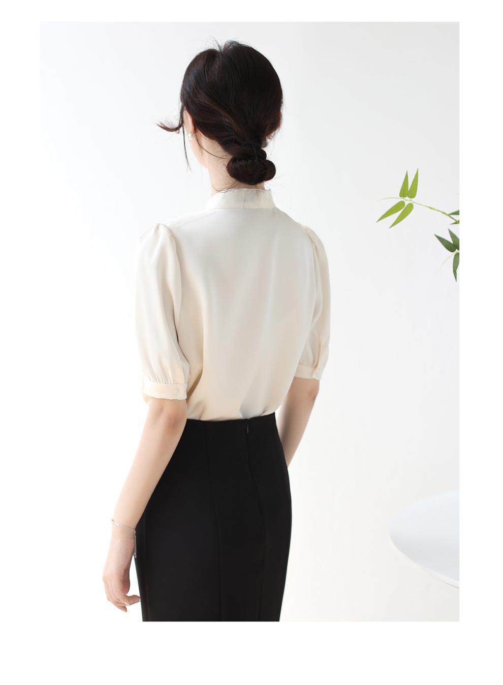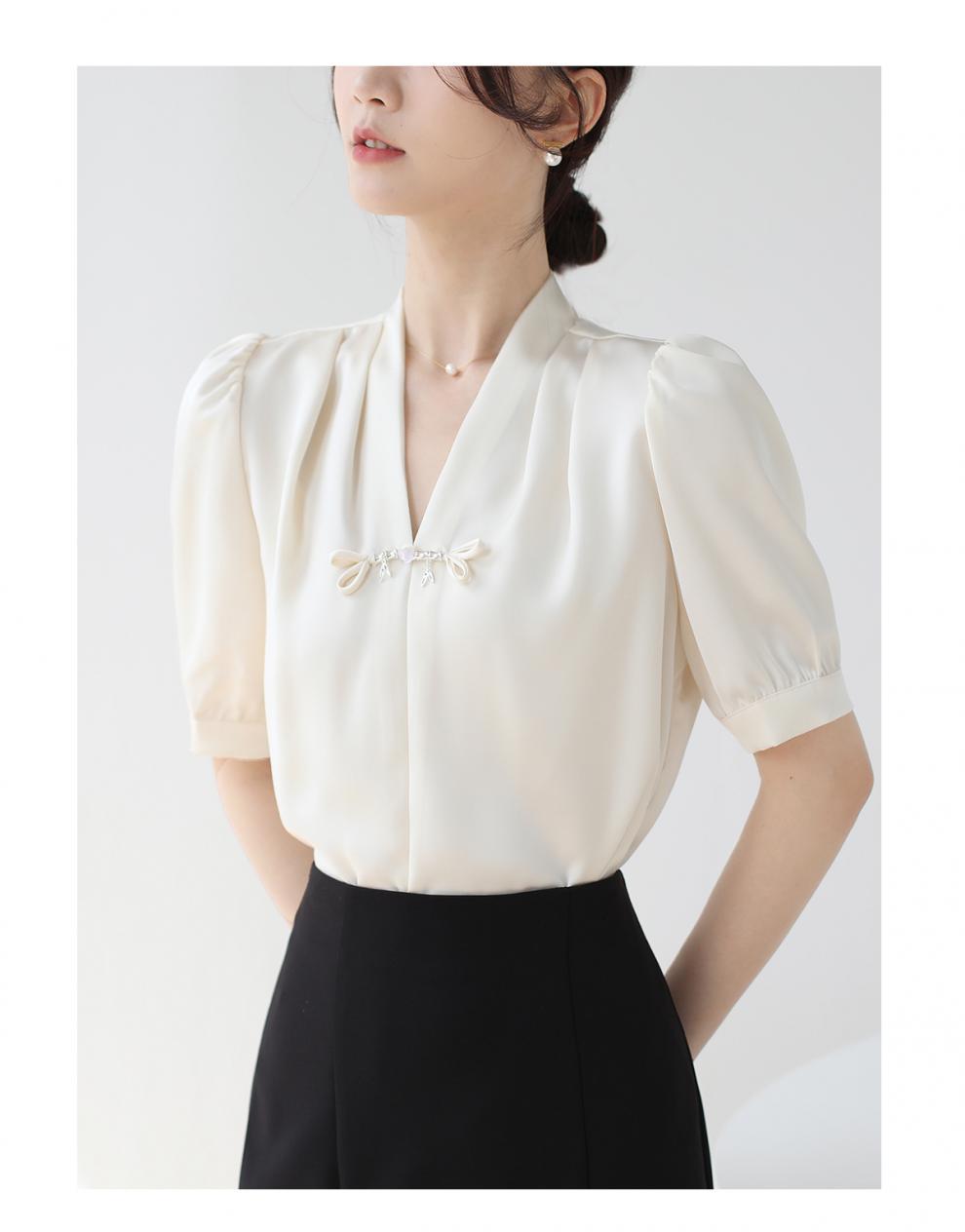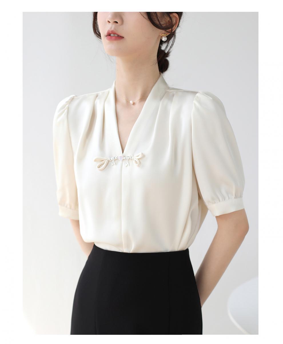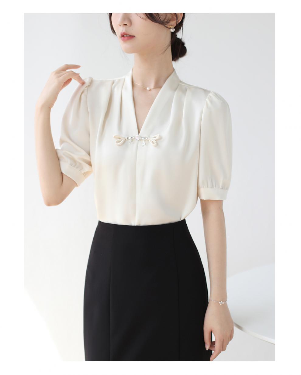 그물 이미지 복고풍 새로운 중국 스타일 V 넥 버클 짧은 소매 셔츠 여성의 여름 새로운 빛 국가 스타일 새틴 작은 셔츠 탑
