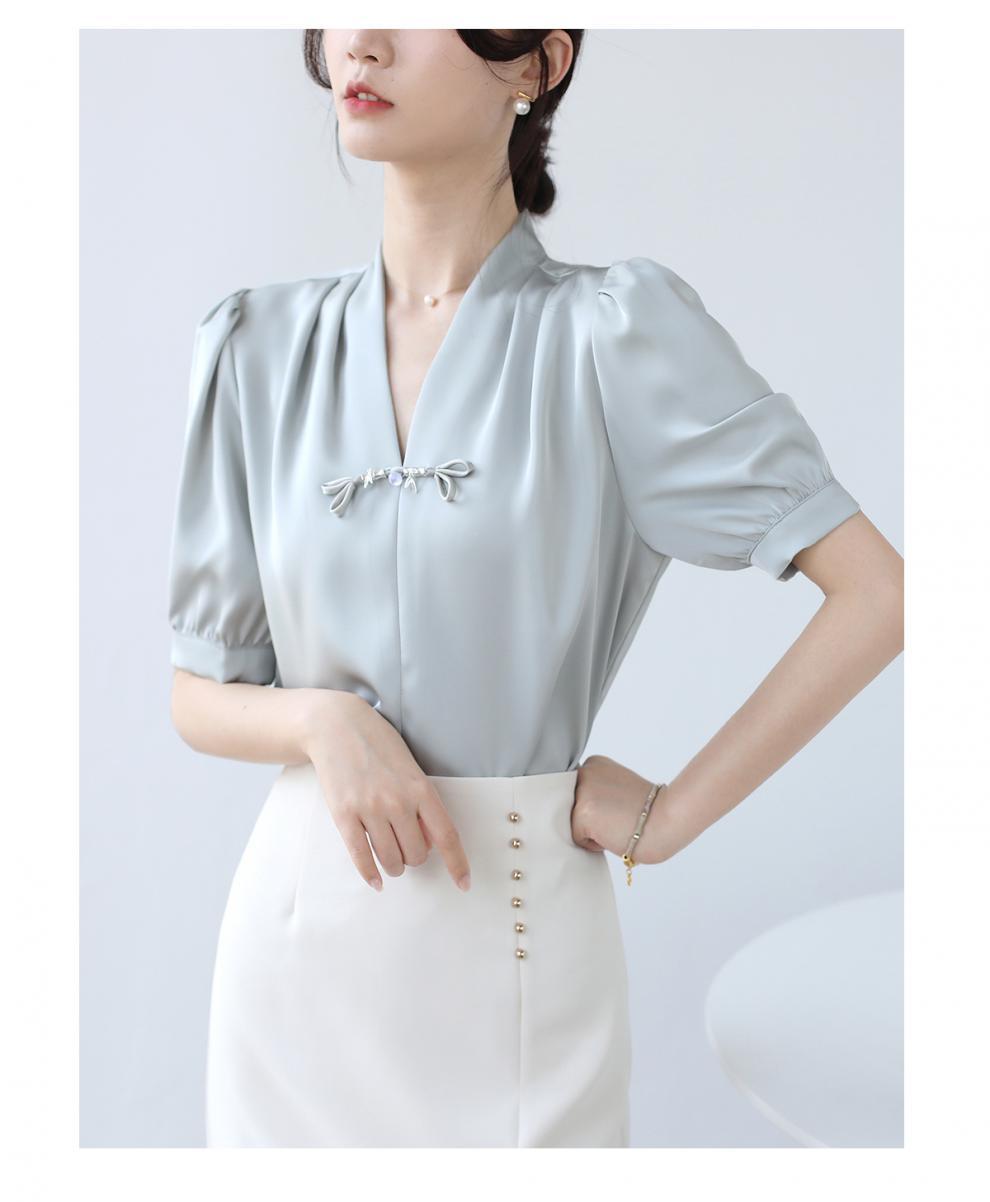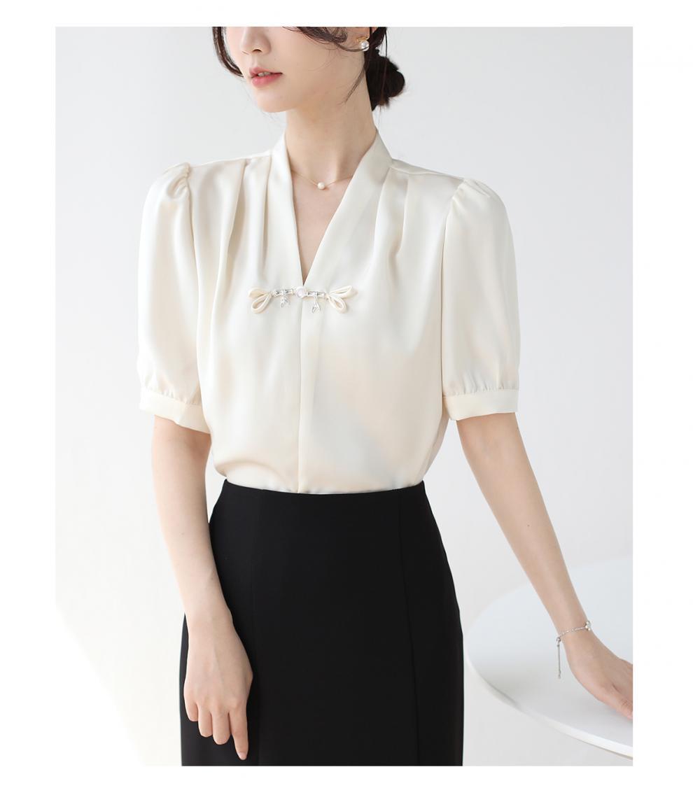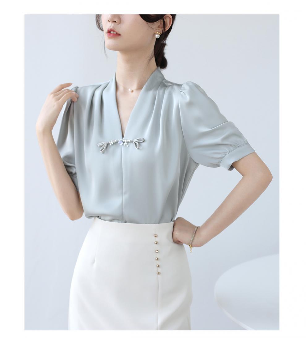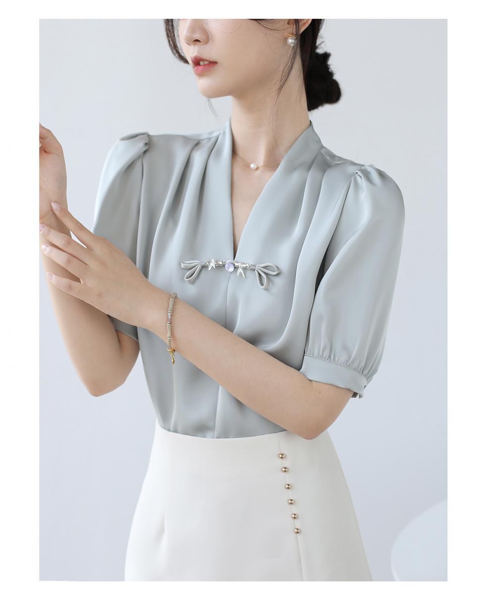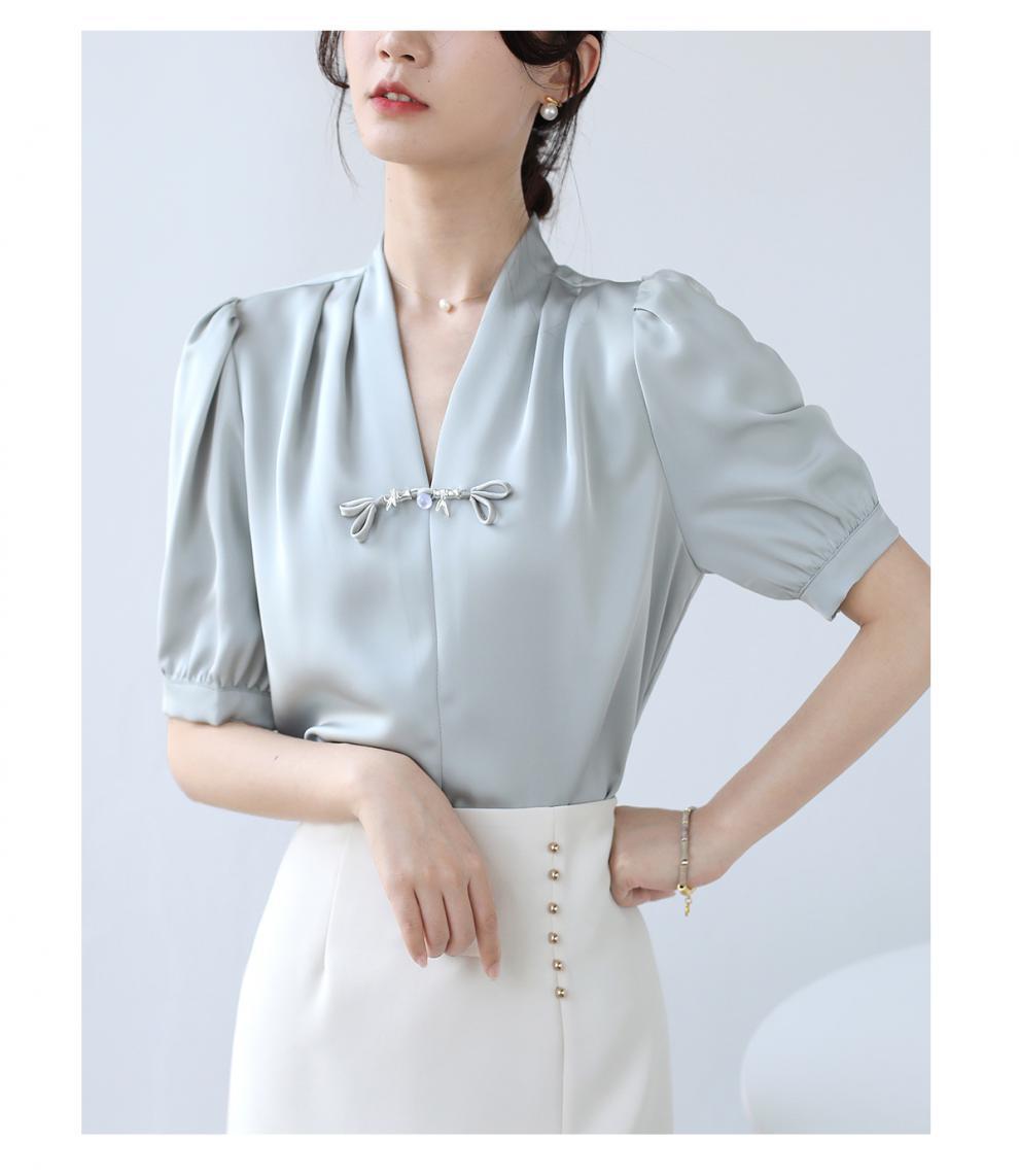 그물 이미지 복고풍 새로운 중국 스타일 V 넥 버클 짧은 소매 셔츠 여성의 여름 새로운 빛 국가 스타일 새틴 작은 셔츠 탑스토어 가기