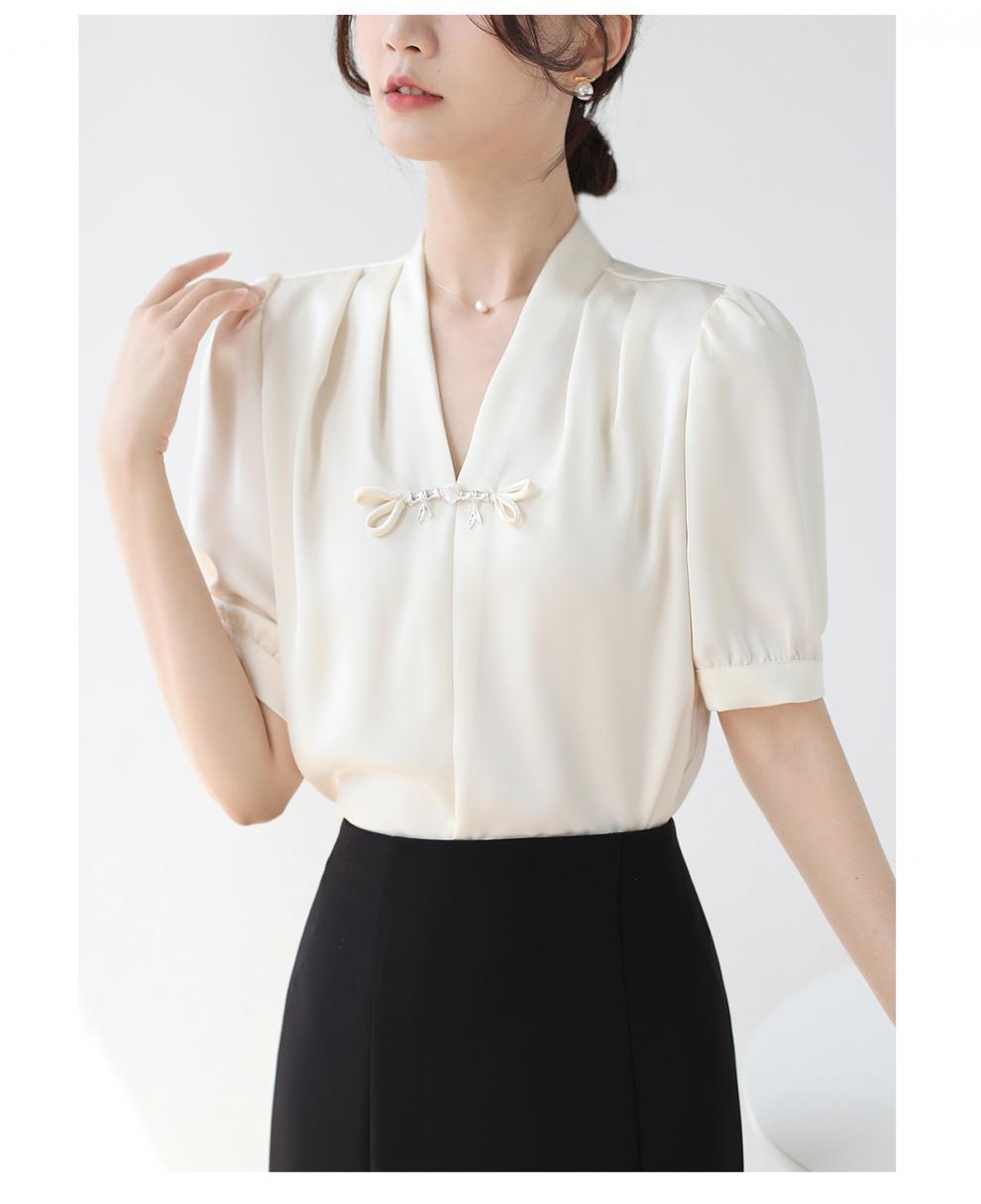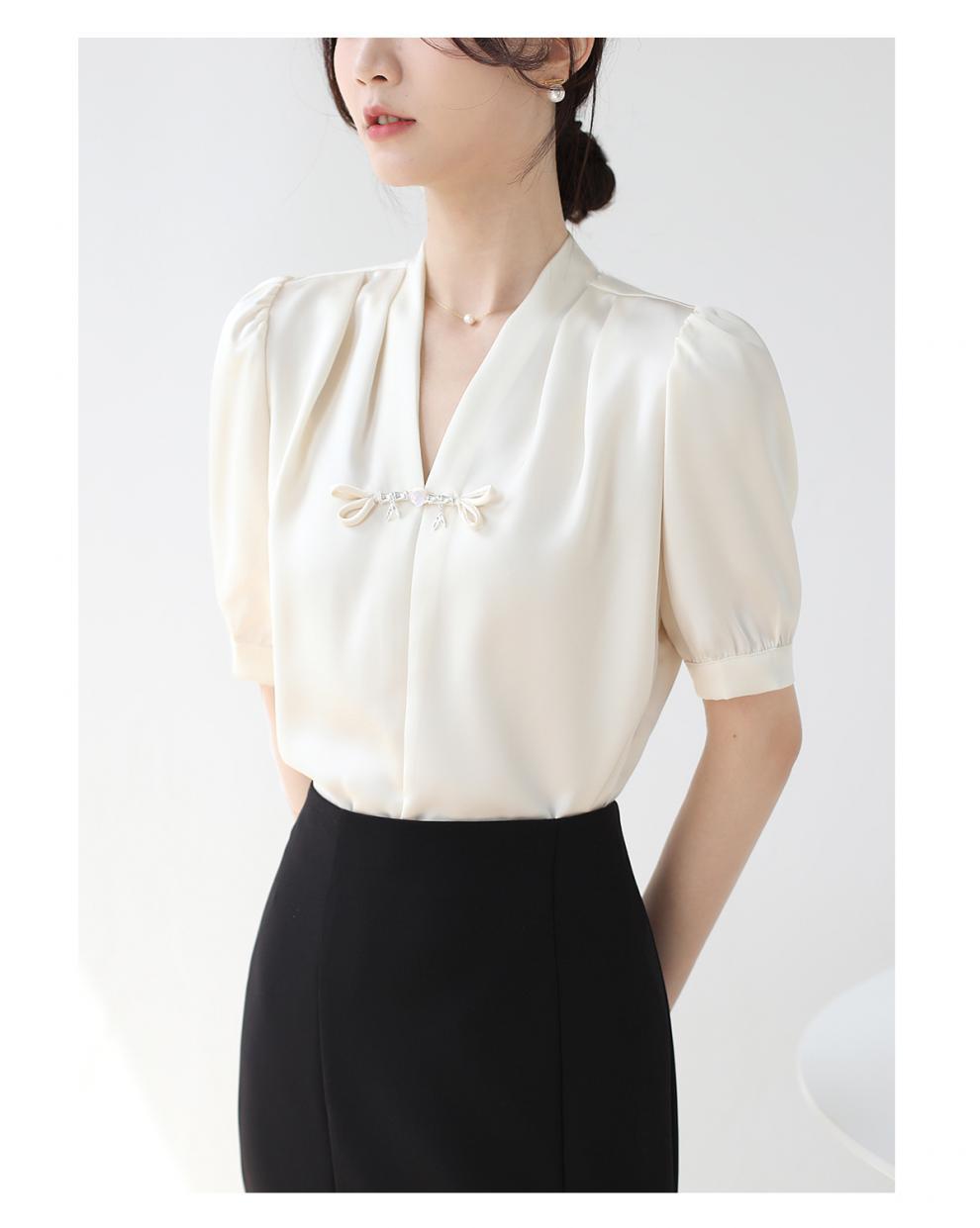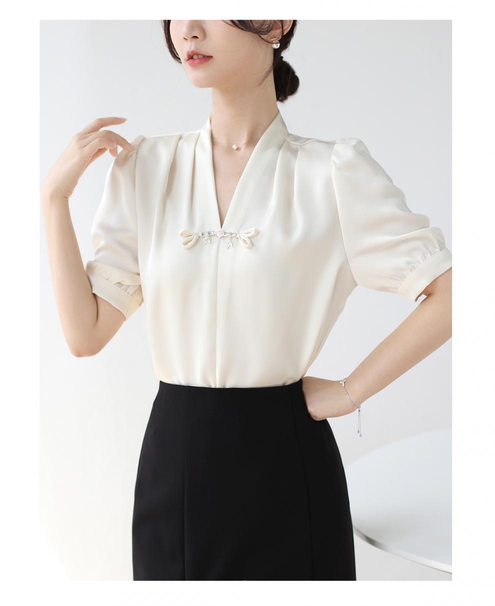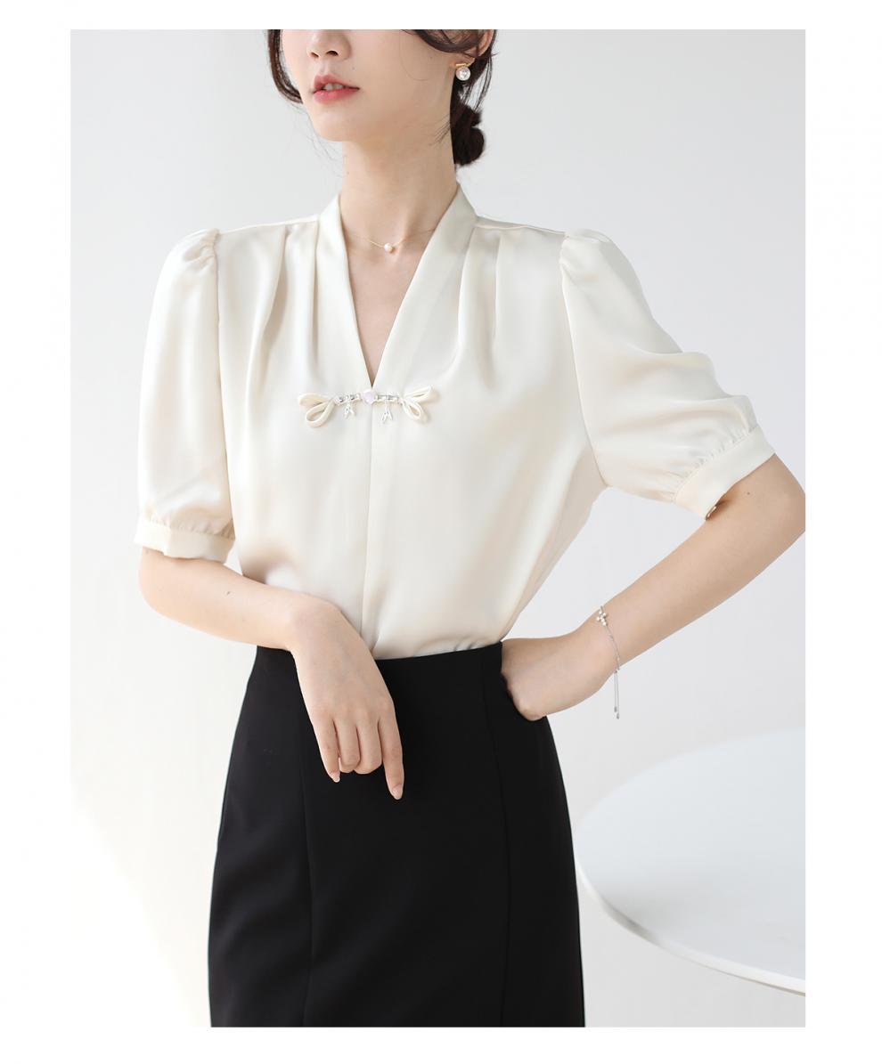 그물 이미지 복고풍 새로운 중국 스타일 V 넥 버클 짧은 소매 셔츠 여성의 여름 새로운 빛 국가 스타일 새틴 작은 셔츠 탑스토어 가기