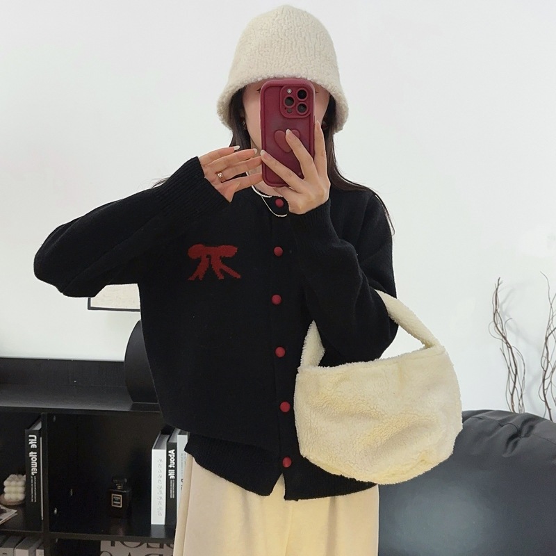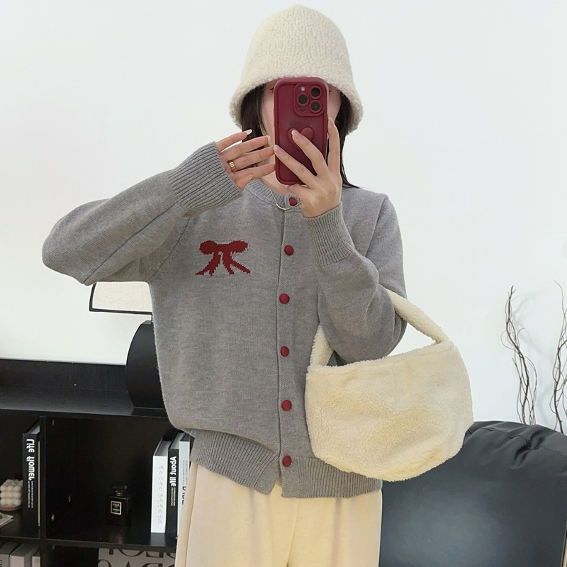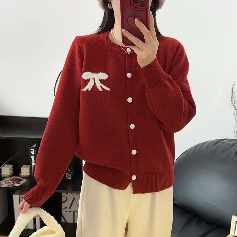 한국 스타일 가을과 겨울 새로운 부드러운 왁스 나이를 줄이는 활 자카드 스웨터 재킷 작은 크루 넥 니트 카디건 여성 트렌디