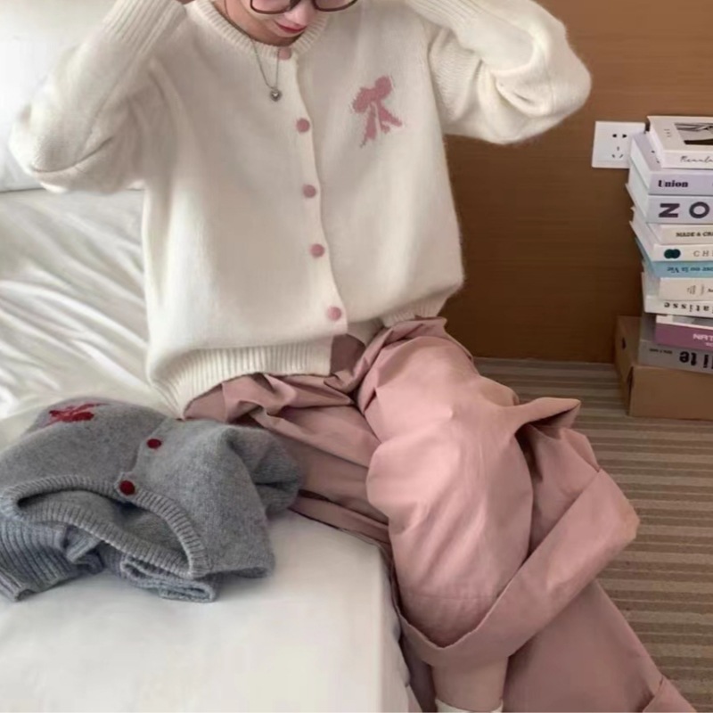 한국 스타일 가을과 겨울 새로운 부드러운 왁스 나이를 줄이는 활 자카드 스웨터 재킷 작은 크루 넥 니트 카디건 여성 트렌디스토어 가기