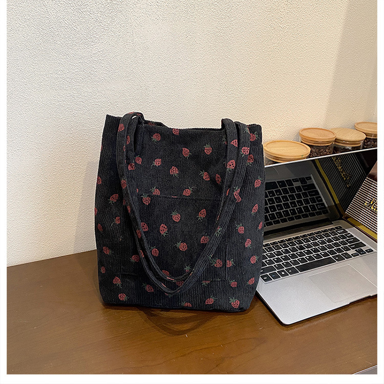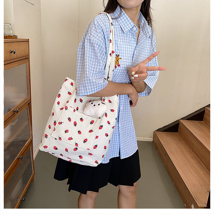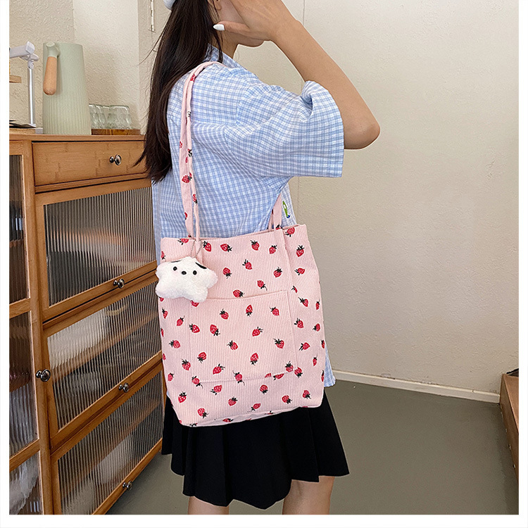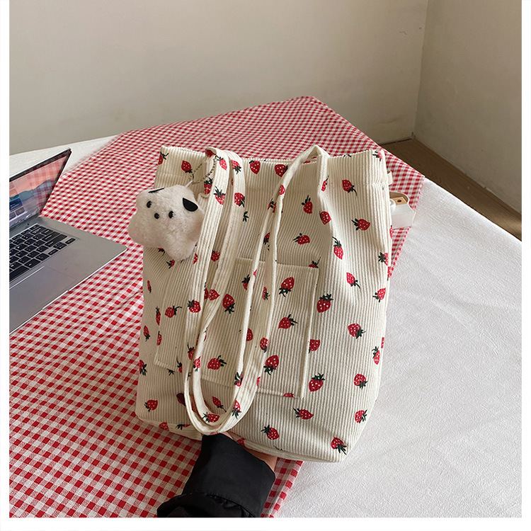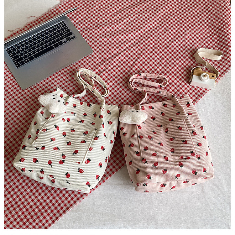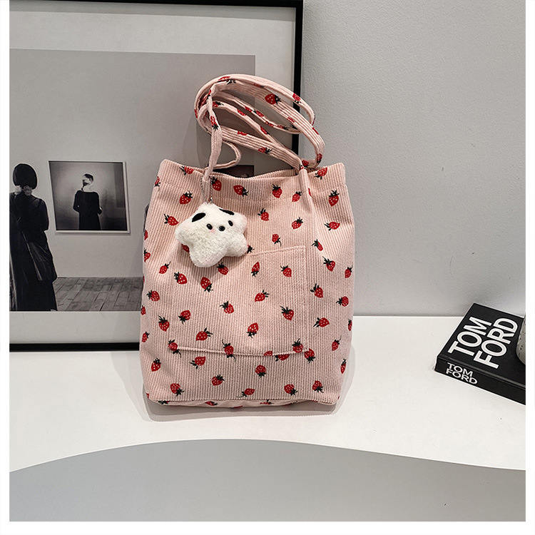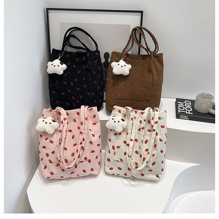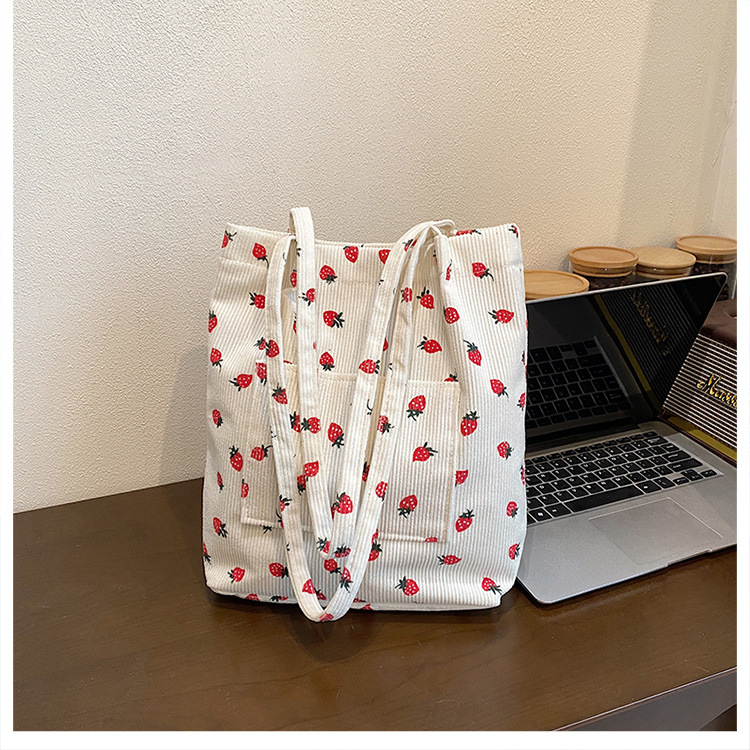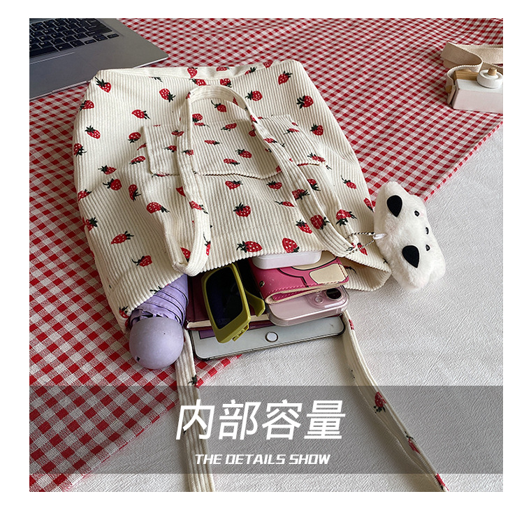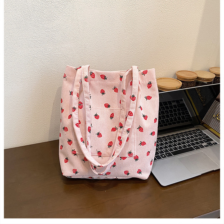 대용량 패션 코듀로이 여성용 어깨 가방 2024 새로운 딸기 인쇄 토트 백 유행 학생 배낭스토어 가기