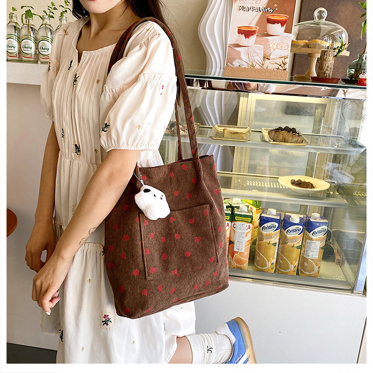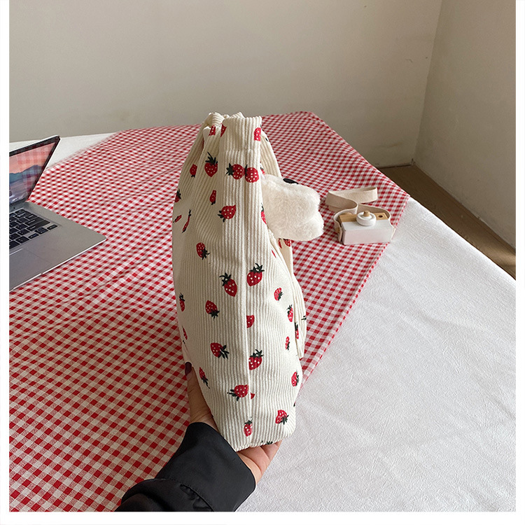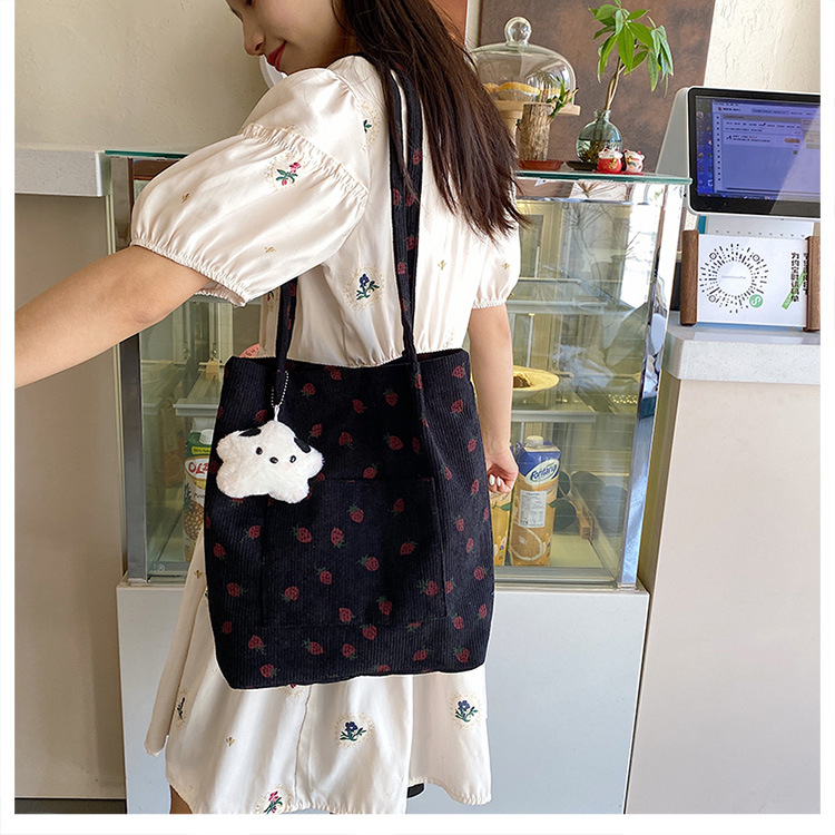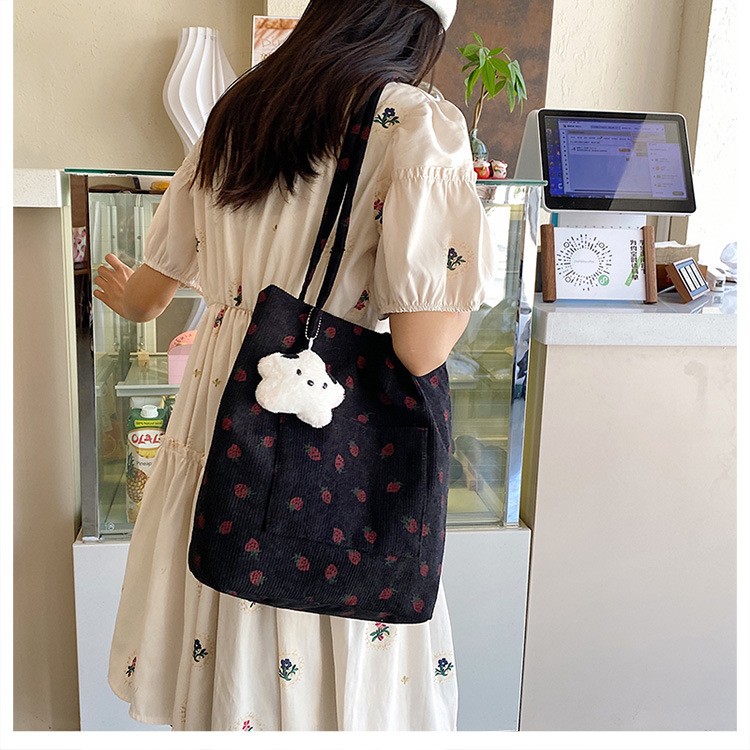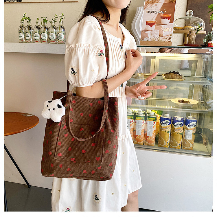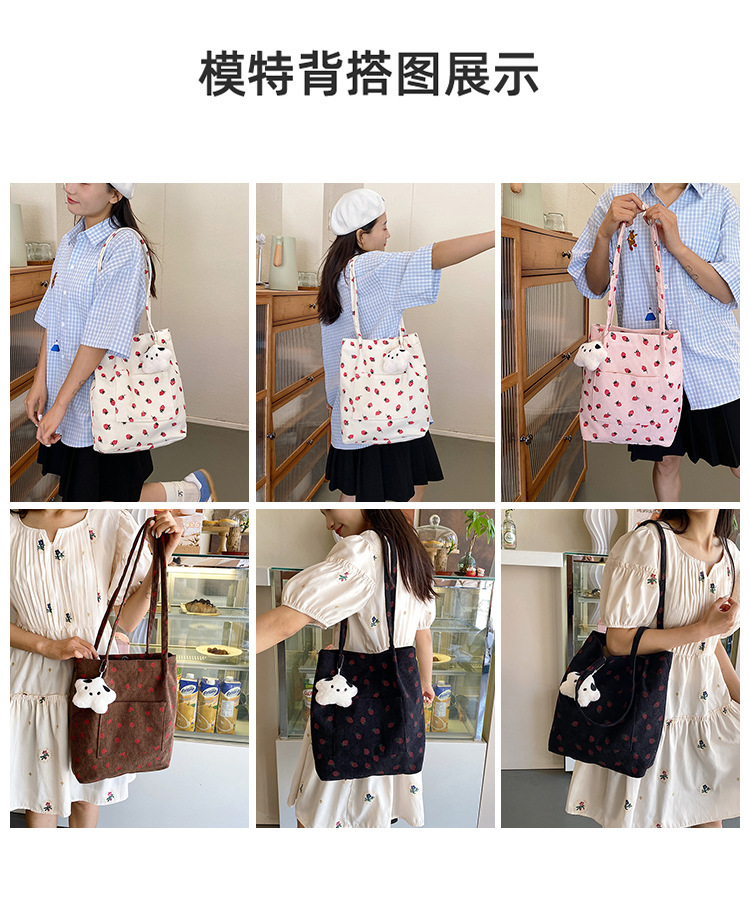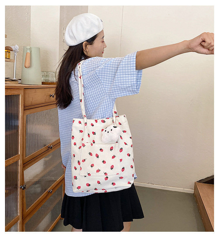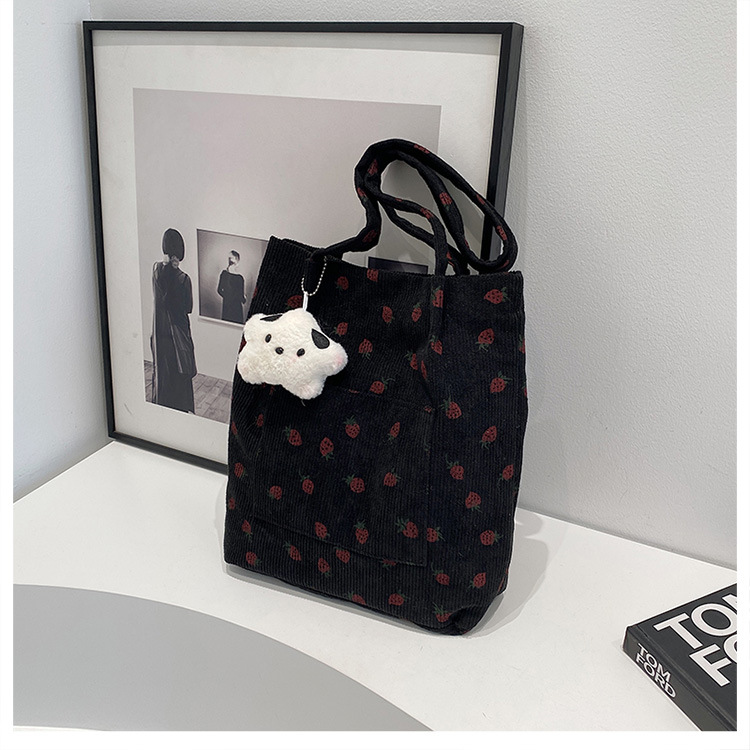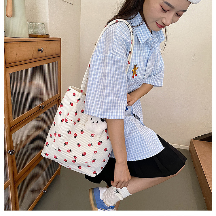 대용량 패션 코듀로이 여성용 어깨 가방 2024 새로운 딸기 인쇄 토트 백 유행 학생 배낭스토어 가기