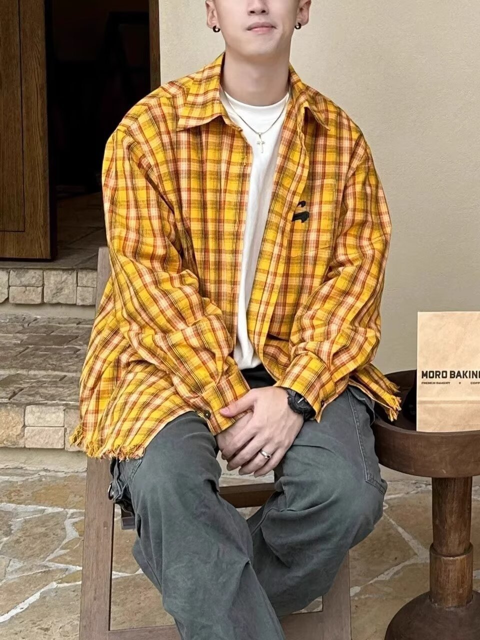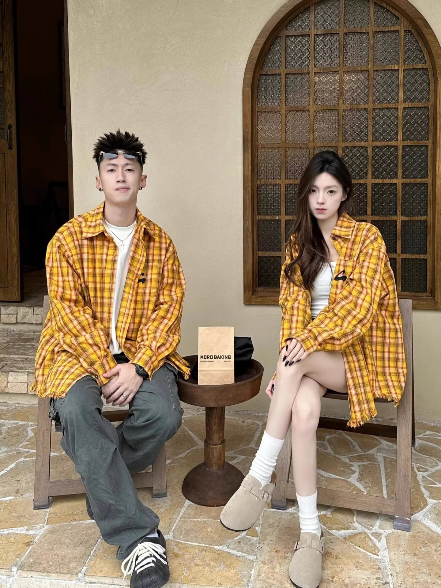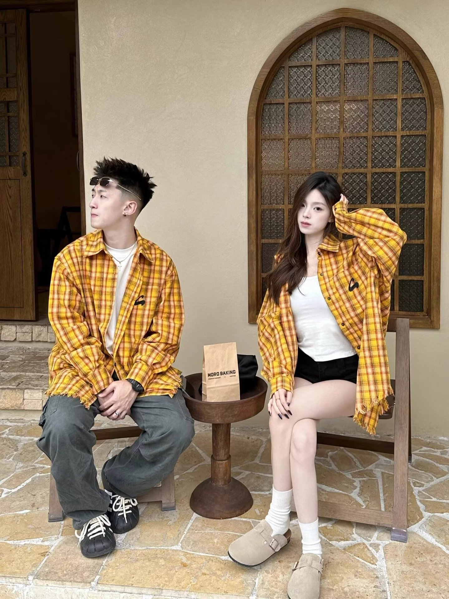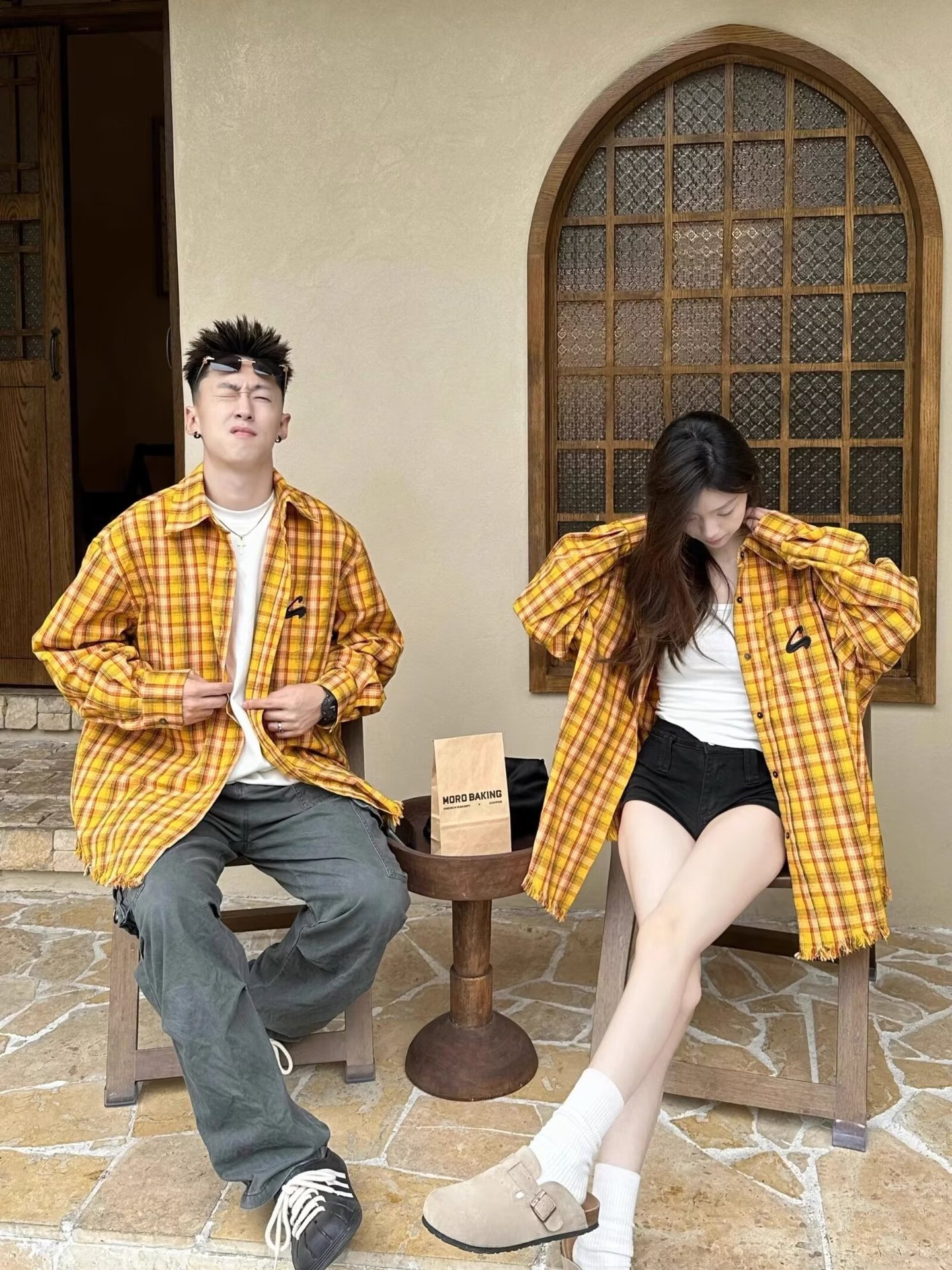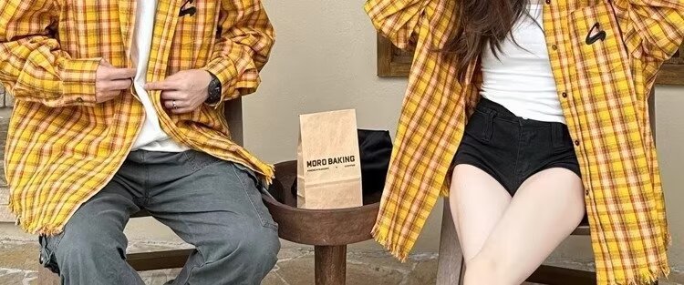 미국 스타일의 복고풍 노란색 격자 무늬 셔츠 재킷 남성과 여성을위한 봄과 여름 연인 2024 새로운 독특한 세련된 탑 라이닝스토어 가기