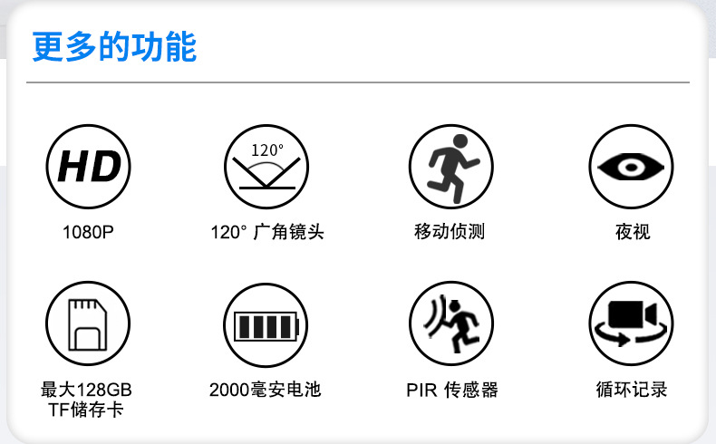 功 能:录像,PIR 人体感应,红外夜视,带IR-CUT ,循环覆盖,时间设置。AP 热点WIFI 手机查看( 非远程实时)