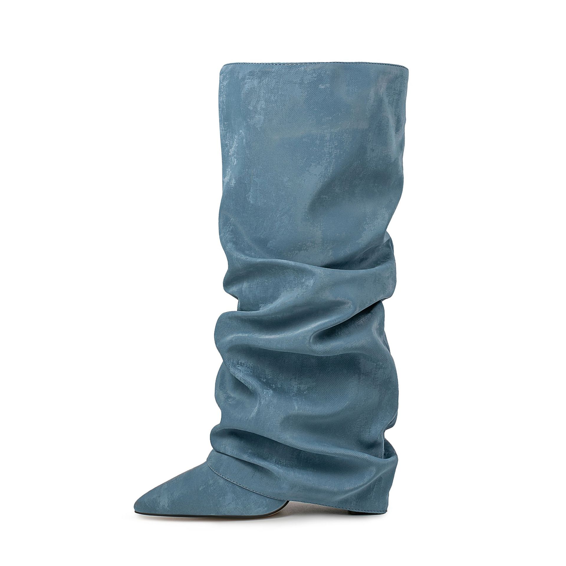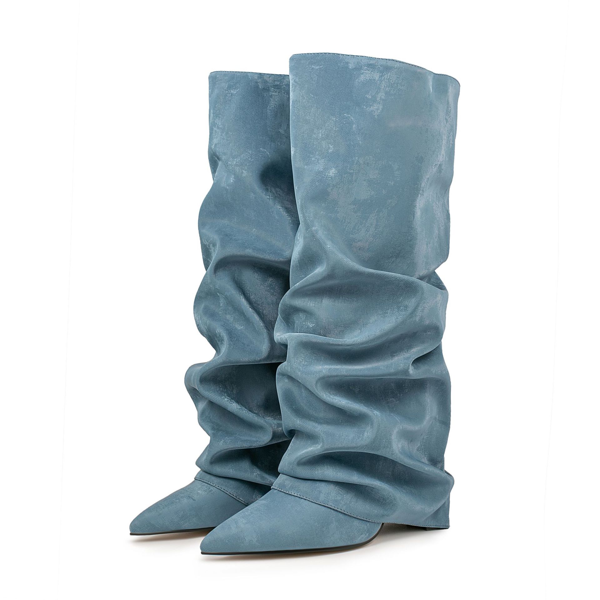 봄과 가을 유럽과 미국의 대외 무역 포인티드 웨지 실크 새틴 대형 하이힐 스커트 바지 부츠 슬리밍 여성 무릎 높이 부츠