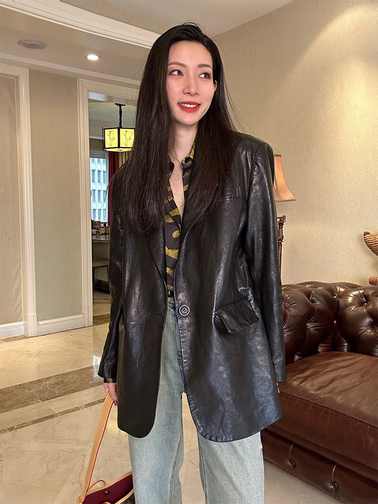 오일 왁스 가죽 여성용 느슨한 슬림 스킨 커버 세트 재킷 정품 두 버튼 재킷 유행 높은 제품스토어 가기