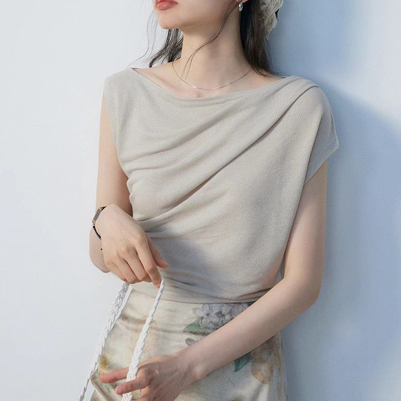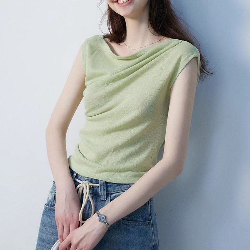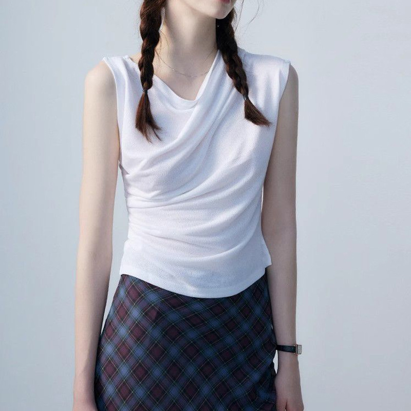 솔리드 컬러 스윙 칼라 불규칙한 조끼 여자 여름 간단한 통근 올 매치 플리츠 디자인 민소매 탑
