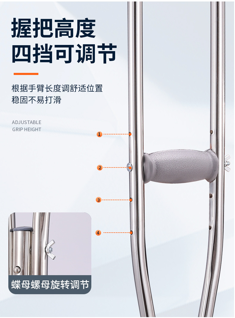스테인레스 스틸 의료 골절 젊은 사람들의 목발 미끄럼 방지 충격 흡수 성인 조절 높이 겨드랑이 두 번 목발 봄