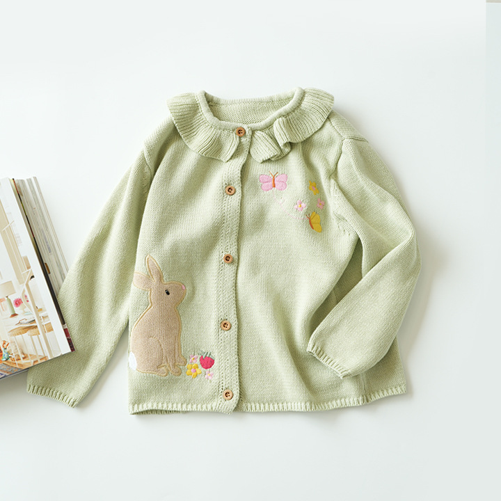 가을, 겨울 새로운 아동 의류 캐주얼 아동 스웨터 소녀 카디건 만화 토끼 수 놓은 연꽃 잎 칼라 인형 칼라 스웨터스토어 가기