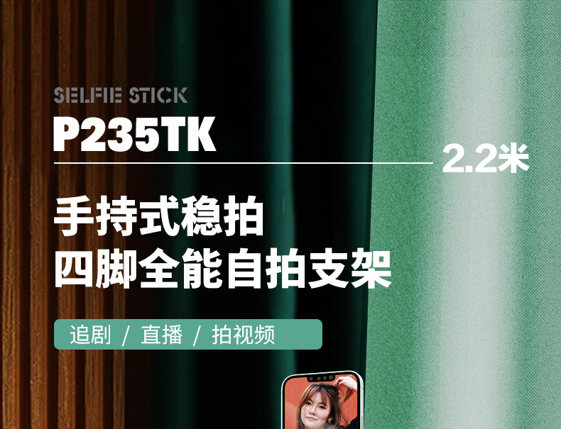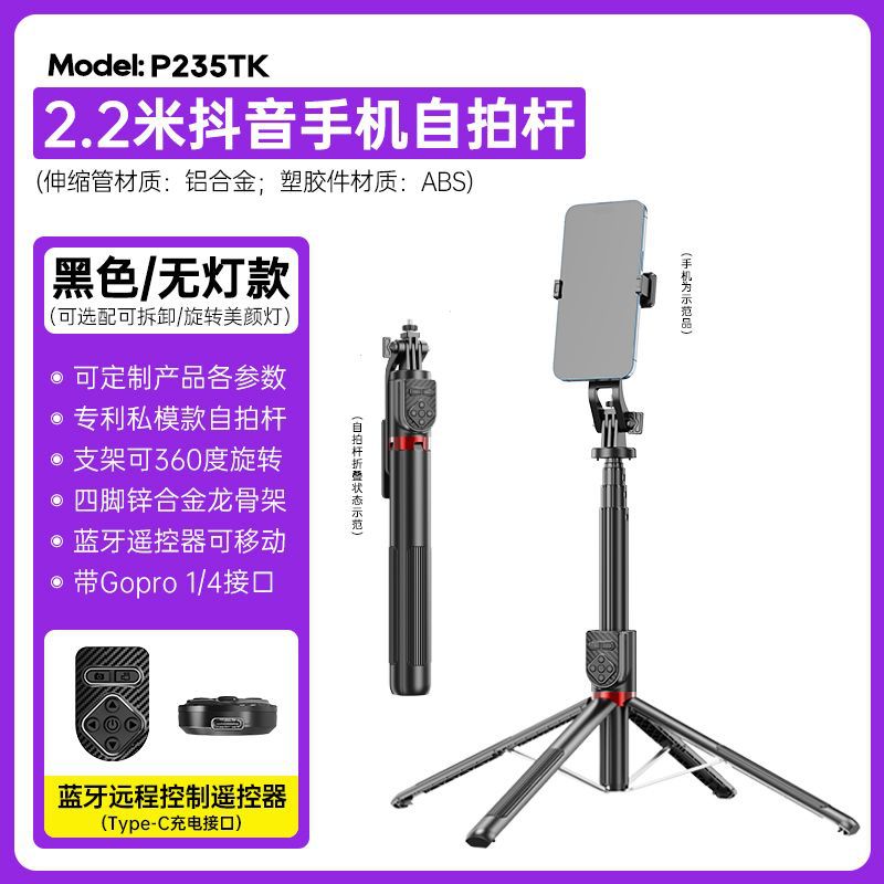 P235TK 다기능 휴대폰 셀카봉, 흔들림 방지, 확장 가능, 알루미늄 합금, 틱톡 블루투스 리모컨 셀카봉스토어 가기