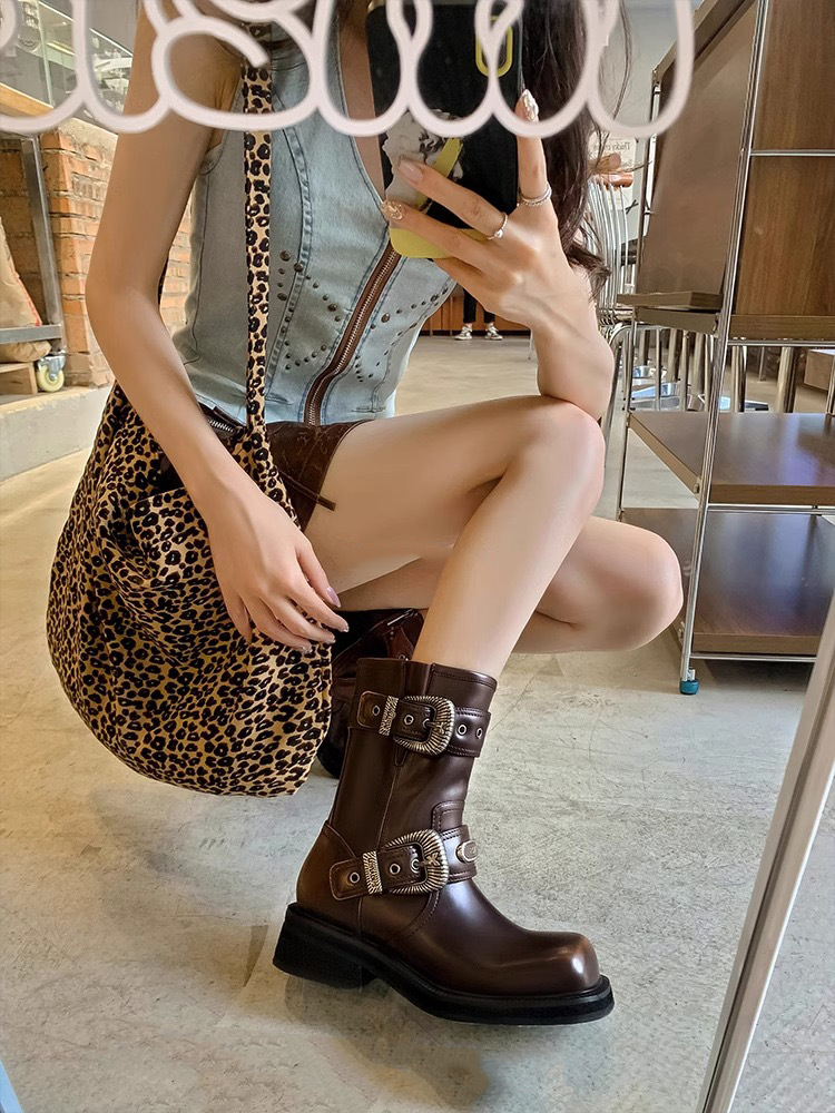 Zhao Zhaoyi 같은 스타일 Maillard 정품 가죽 컬러 여성 금속 버클 영국 짧은 부츠 스파이스 걸스 빈티지 웨스턴 부츠