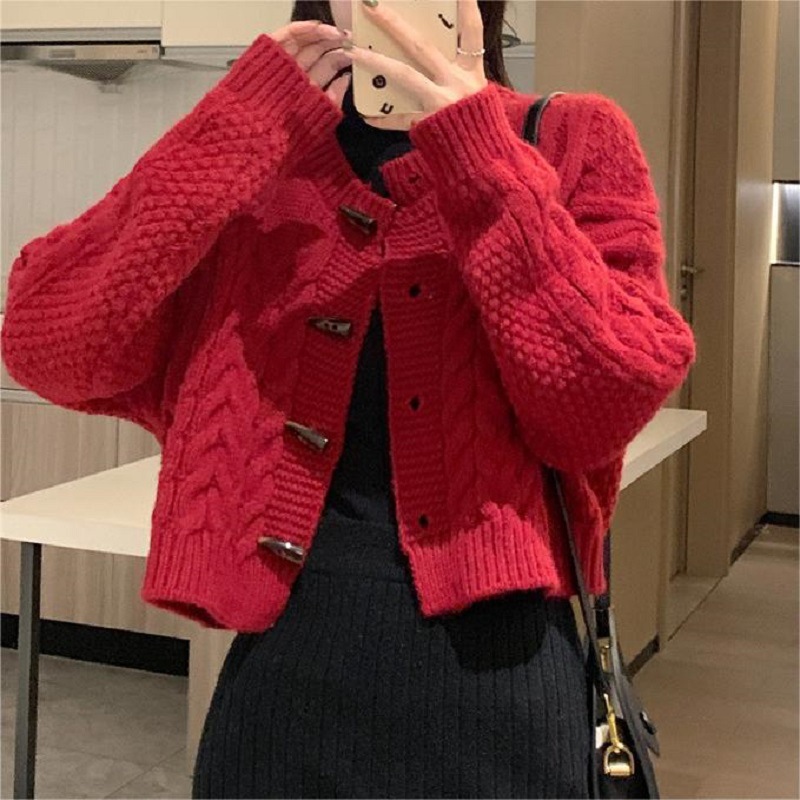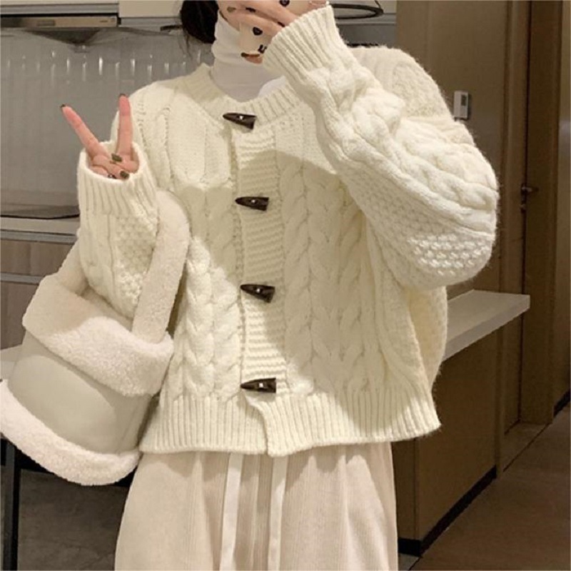 빈티지 혼 버튼 트위스트 스웨터 코트 여성의 가을과 겨울 새로운 일본 스타일 느슨한 게으른 외부 착용 짧은 니트 카디건스토어 가기
