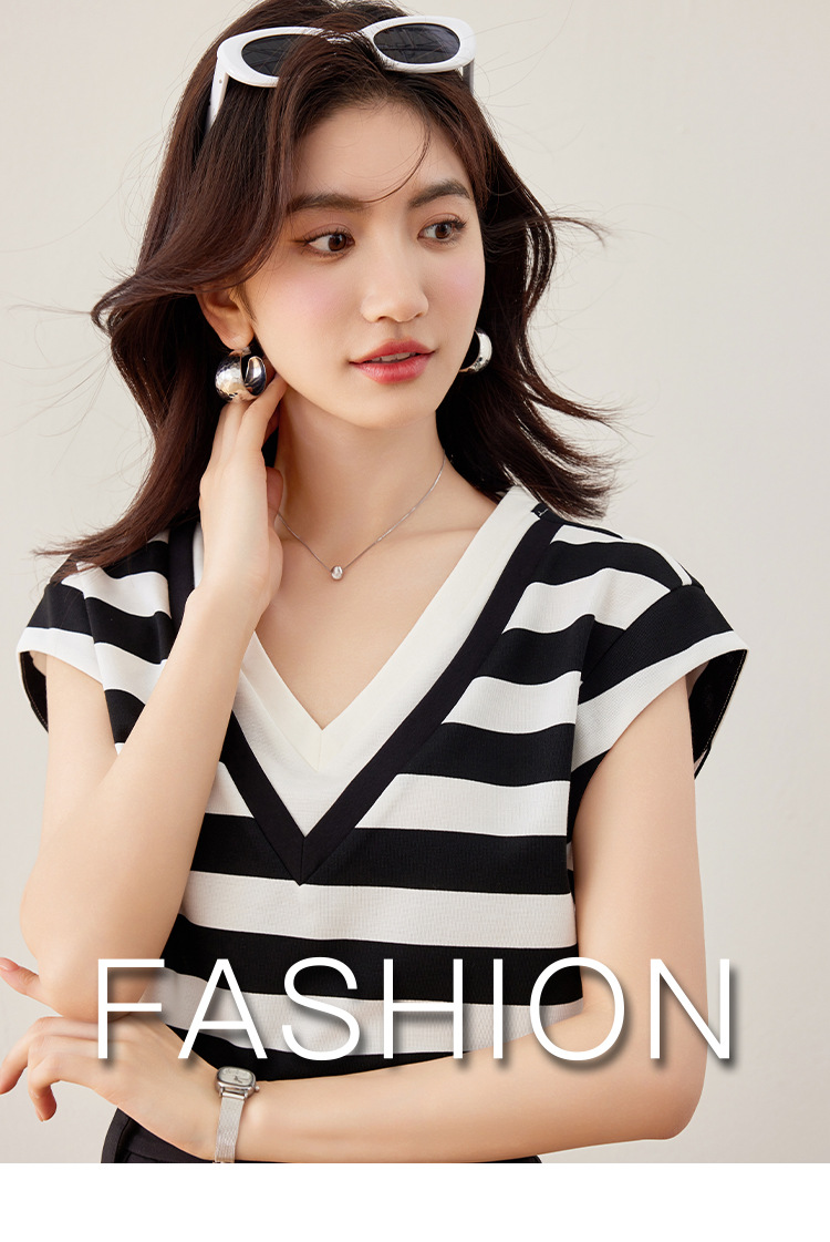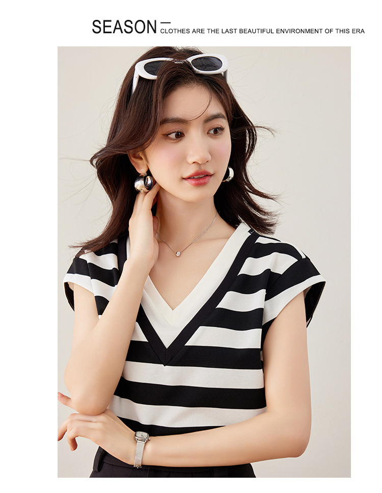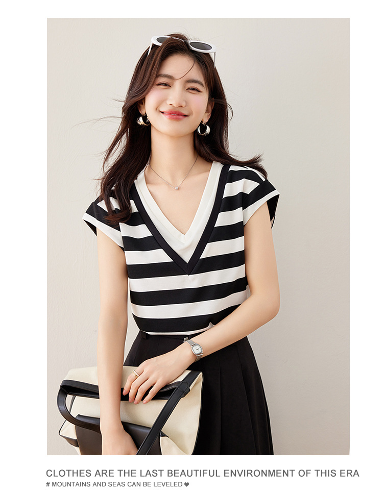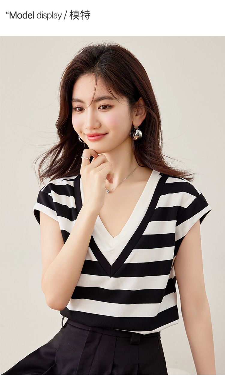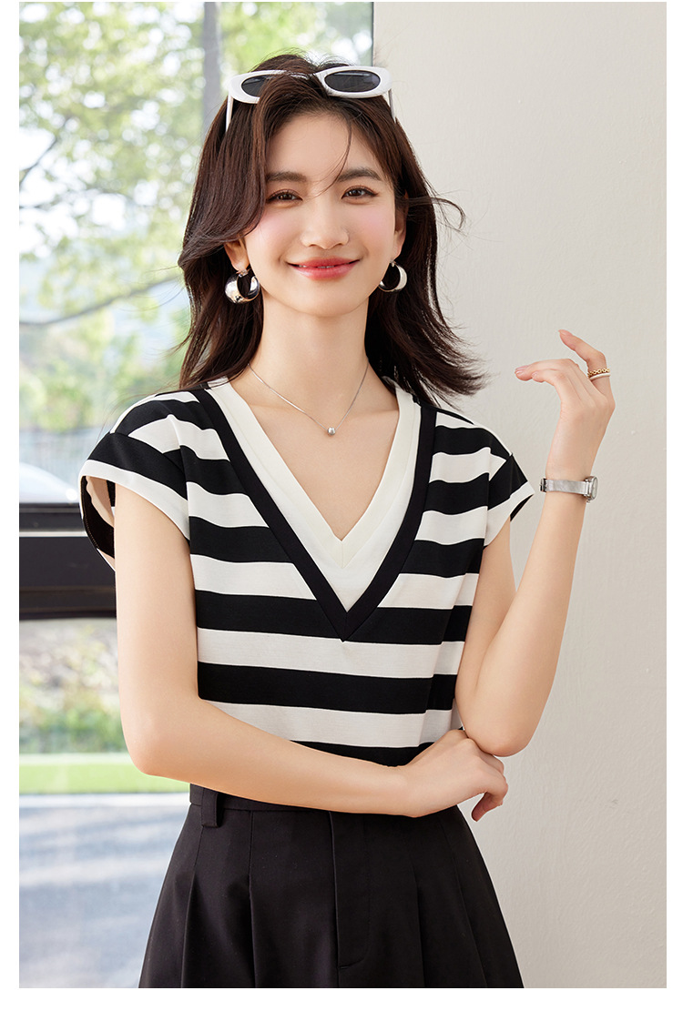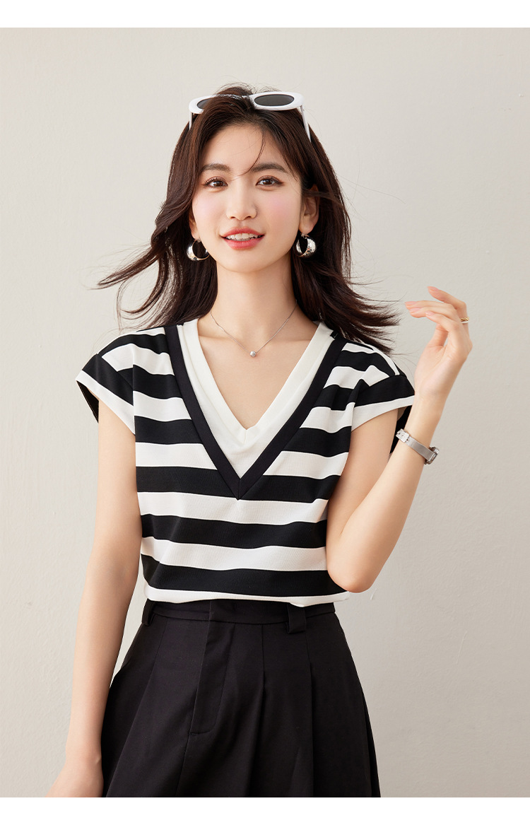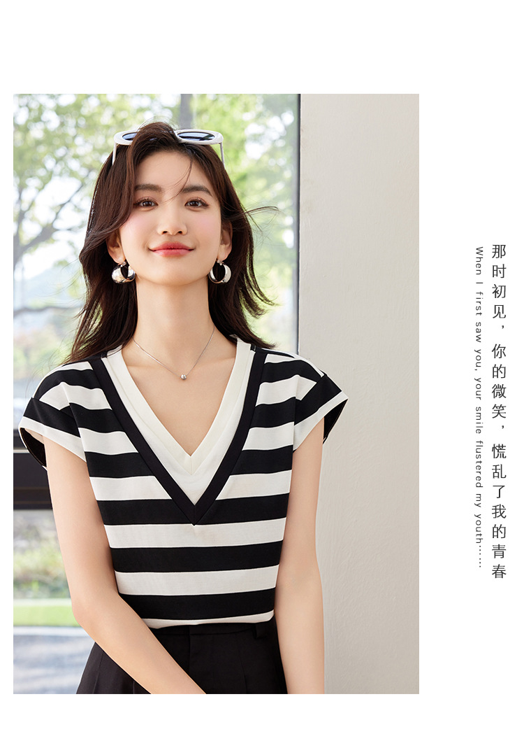2024 년 여름 새로운 한국 가짜 투피스 플라잉 슬리브 V 넥 콜라본 디자인 컬러 매칭 반팔 티셔츠 여성용 트렌디스토어 가기