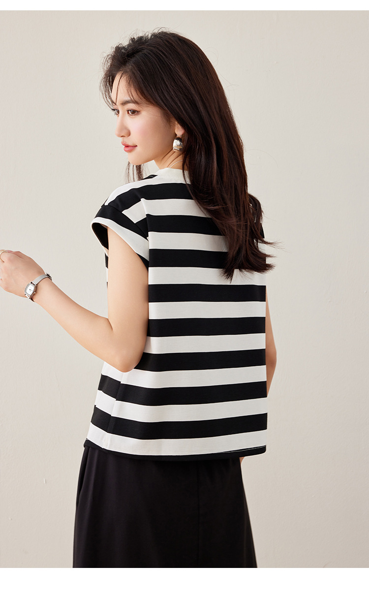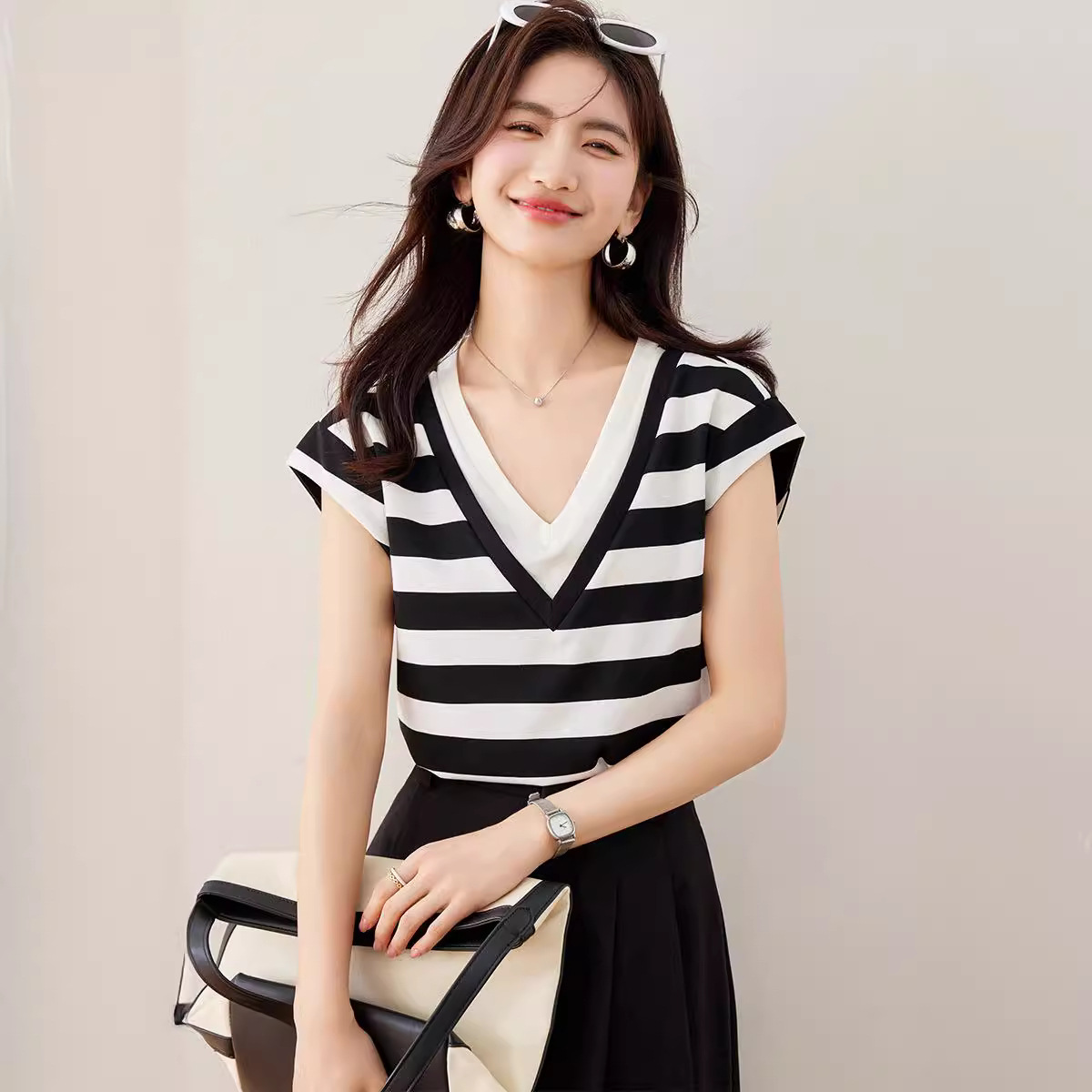 2024 년 여름 새로운 한국 가짜 투피스 플라잉 슬리브 V 넥 콜라본 디자인 컬러 매칭 반팔 티셔츠 여성용 트렌디