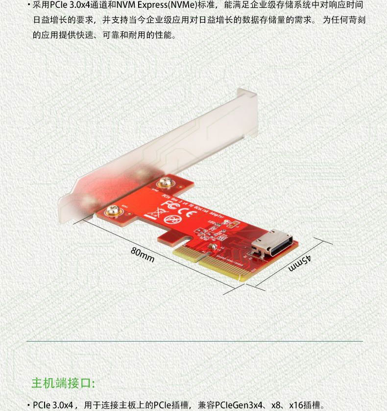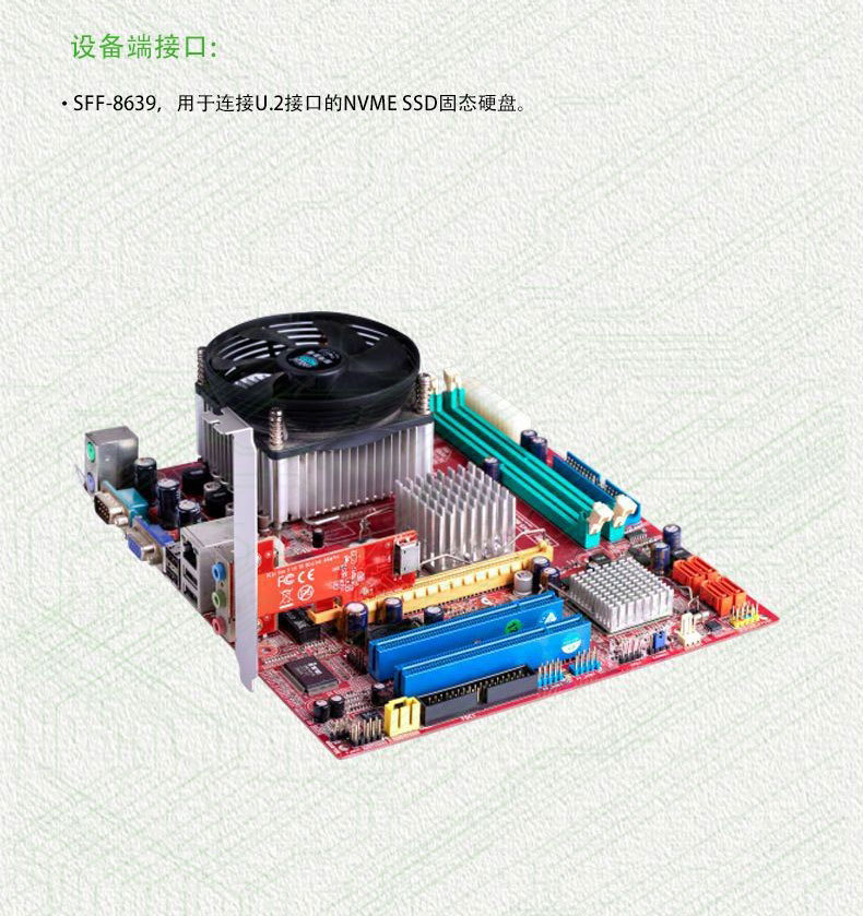 该款转接卡可以把主板上的PCIe接口转换为Oculink SFF-8612接口,通过Oculink SFF-8611转SFF-8639数据线连接各种SFF-8639接口设备。用户还可通过Oculink SFF-8611转SFF-8639数据线连接高性能的 2.5" NVMe U.2 (SFF-8639) SSD固态硬盘,以致力于解决用户对数据大量储存的需求。