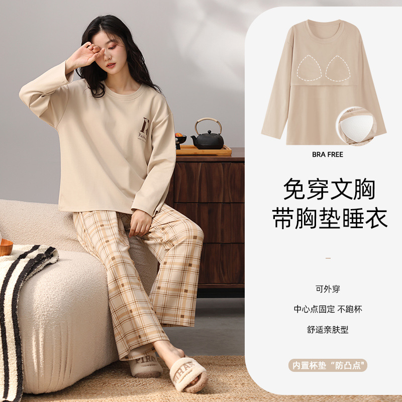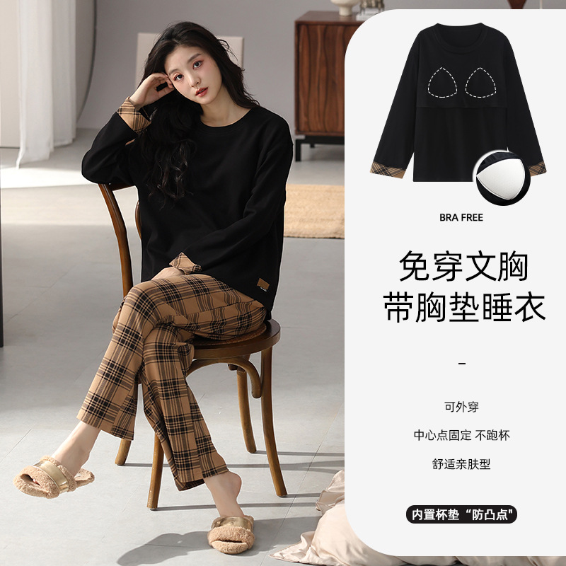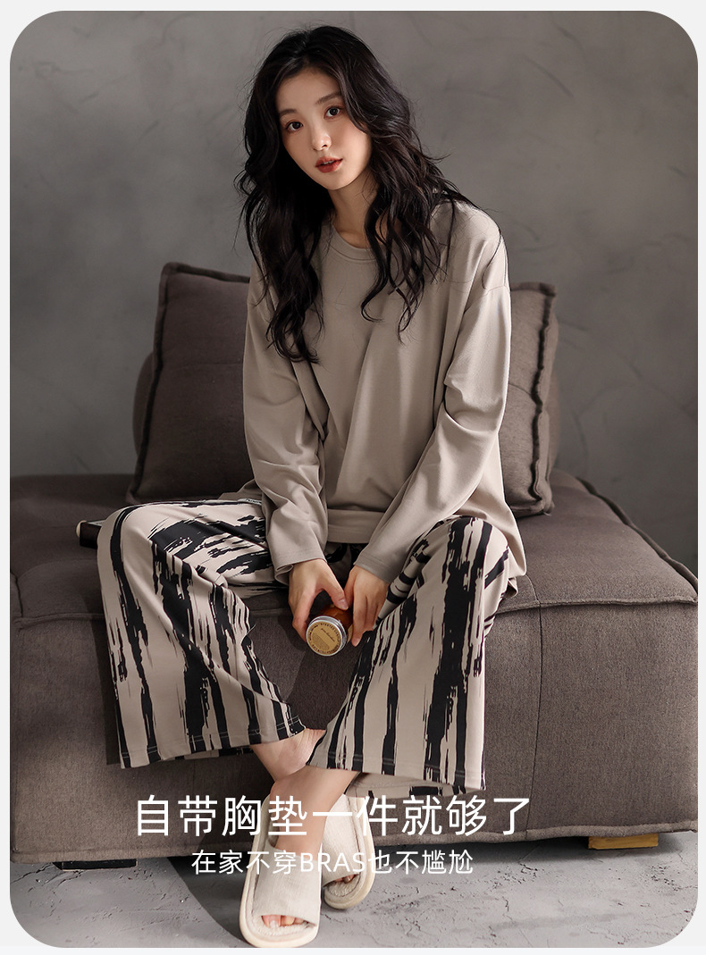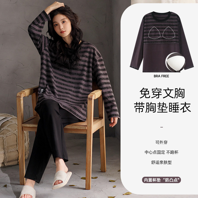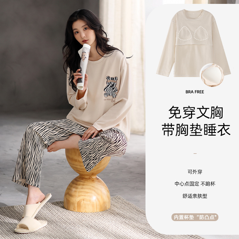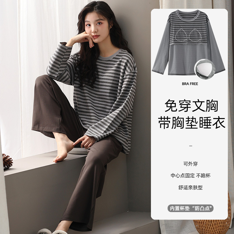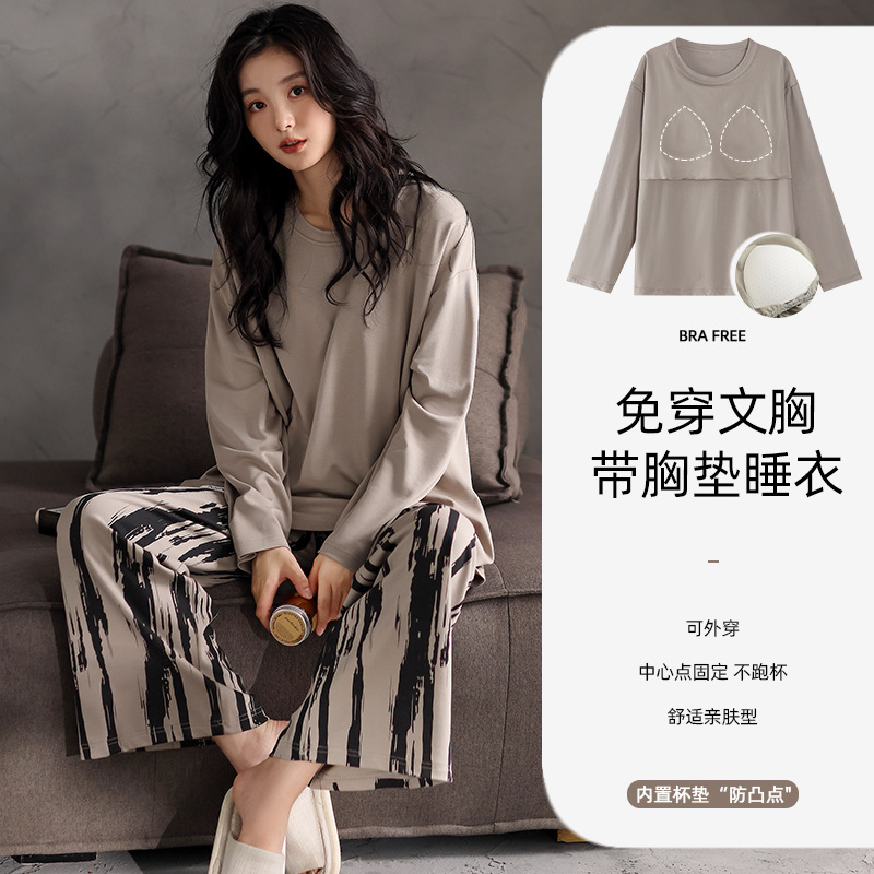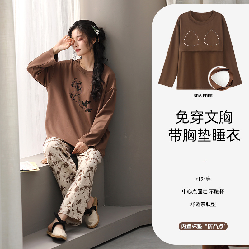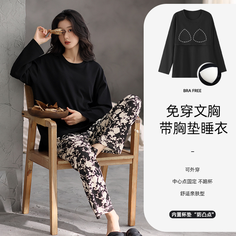 가슴 패드 잠옷 여성 가을 코튼 긴 소매 크루 넥 풀오버 간단한 캐주얼 새 홈 의류 세트 봄과 가을스토어 가기