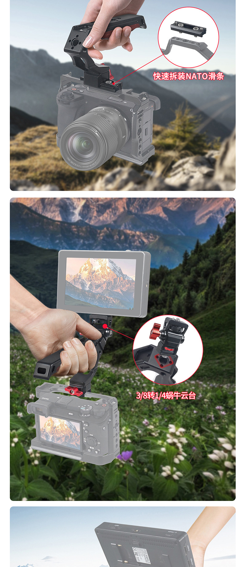 A. 上提手为NATO滑条夹紧快速安装设计,单旋钮控制,可适用于带NATO的滑条兔笼配件,安装稳固;