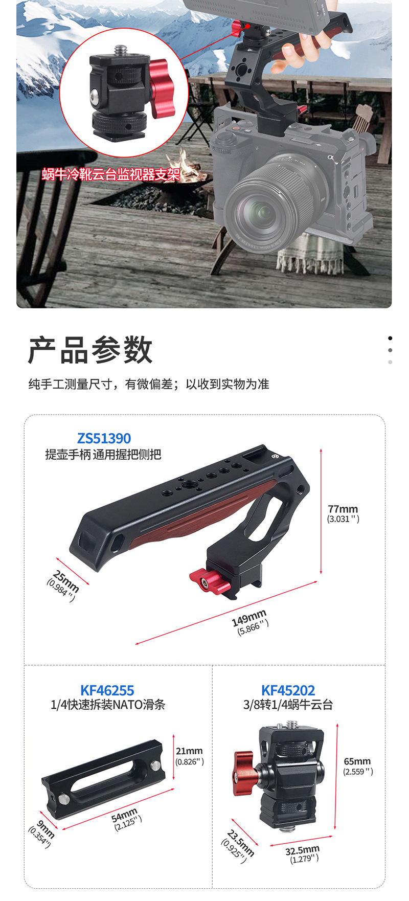 C.产品带有英制1/4-20阿莱定位孔和3/8-16阿莱定位孔,可以安装1/4和3/8阿莱定位配件(阿莱定位蜗牛云台/阿莱定位魔术手)