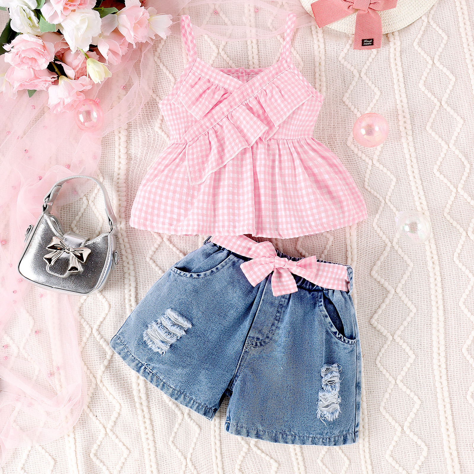 국경 간 한국식 소녀 세트 여름 새 슬링 격자 불규칙한 탑 구멍 데님 반바지