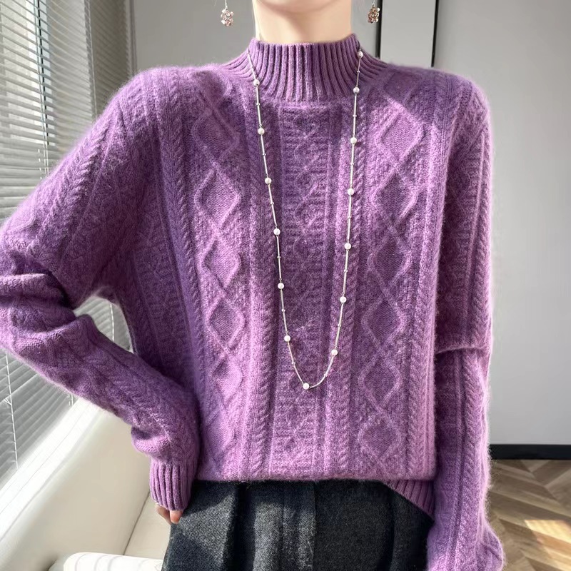 가을과 겨울 단단한 반 터틀넥 스웨터 여성의 두꺼운 느슨한 자카드 스웨터 트위스트 플라워 내부 니트 베이스 셔츠