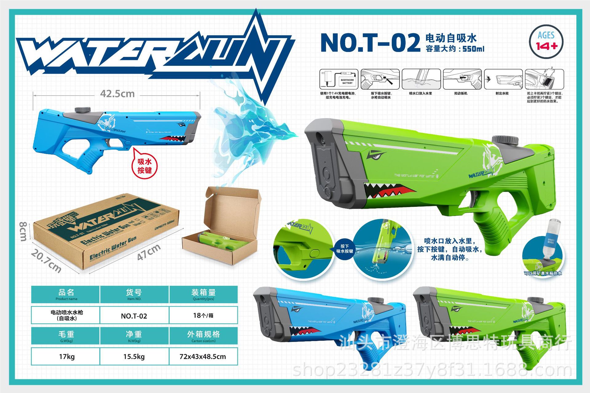 • T-02 상어 전기 물 총-원 버튼 물 흡수를 확장 할 수 있습니다-색상-주의하십시오