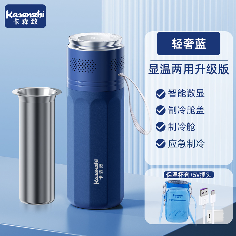 • [라이트 럭셔리 블루 온도 표시 사계절 디럭스 에디션★온도조절] 냉동실 + 금속얼음링 + 컵커버 + 보조배터리