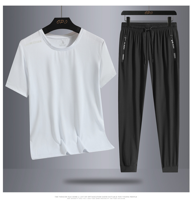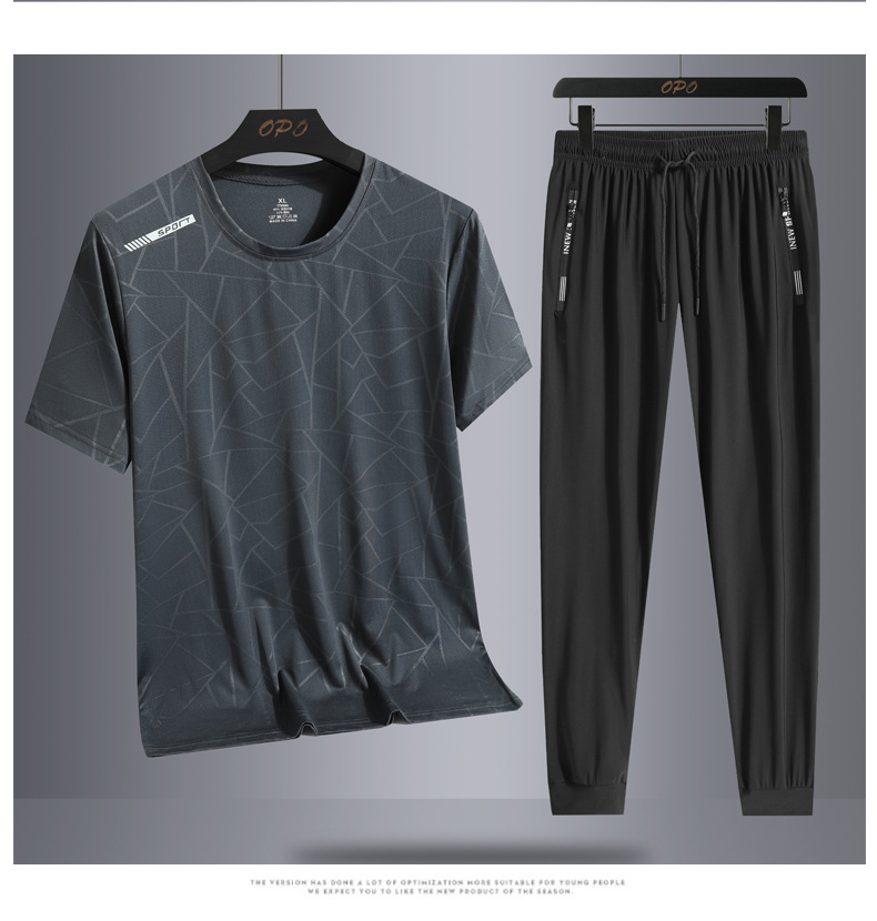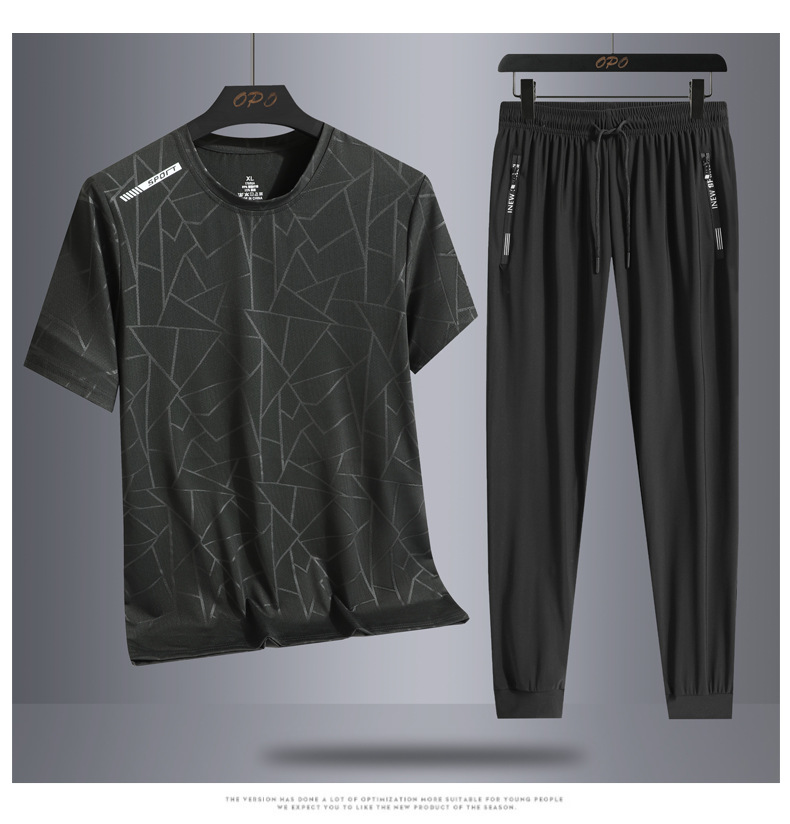 플러스 사이즈 새로운 캐주얼 세트 젊고 중년 반팔 티셔츠 스포츠 세트 남자 아이스 실크 얇은 빠른 건조 바지 세트