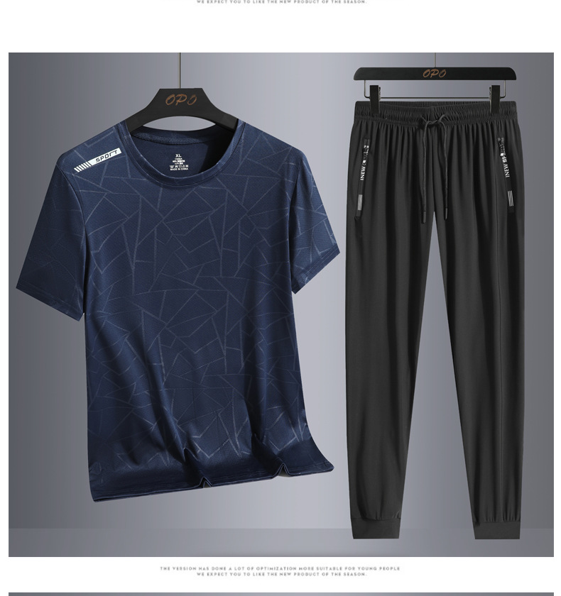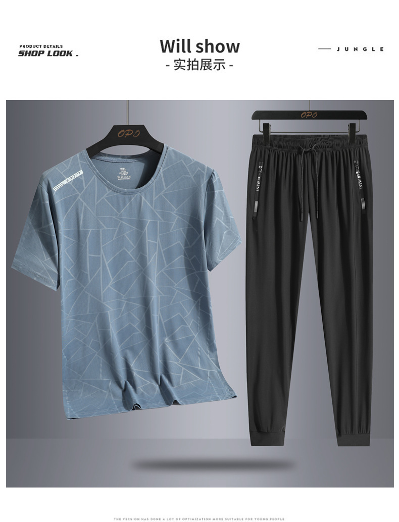 플러스 사이즈 새로운 캐주얼 세트 젊고 중년 반팔 티셔츠 스포츠 세트 남자 아이스 실크 얇은 빠른 건조 바지 세트스토어 가기