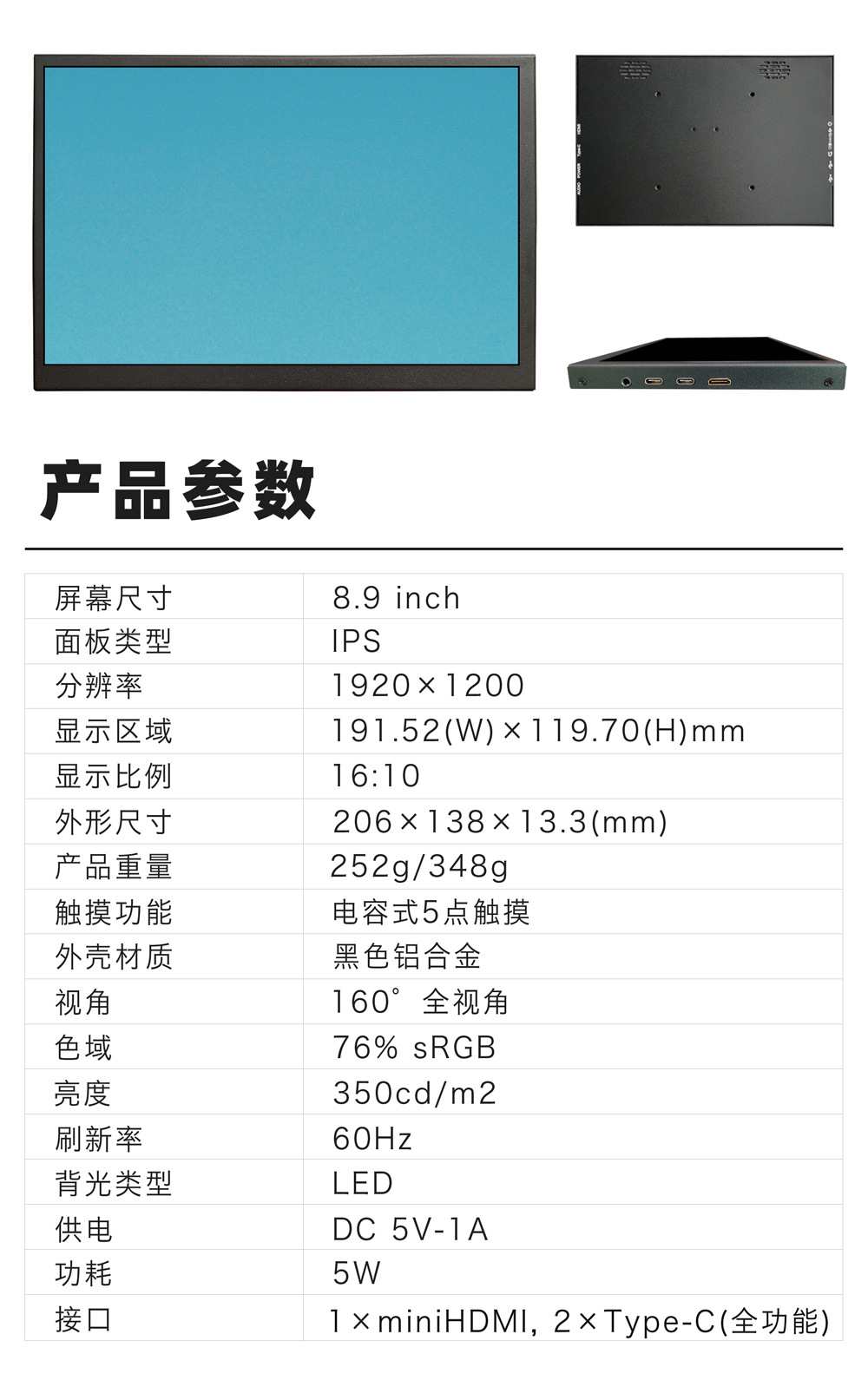 새로운 8.9inch 10포인트 터치 휴대용 디스플레이PS4 스위치 Type-C 원라인 통신 HD 보조 화면