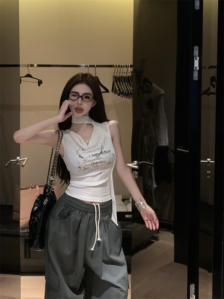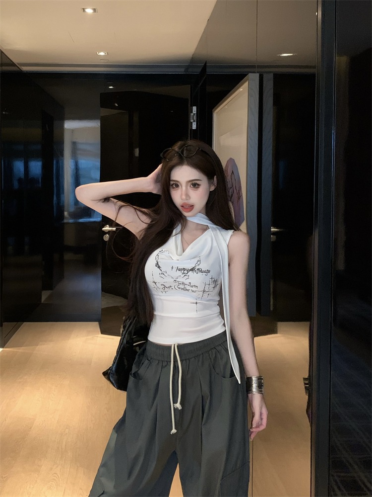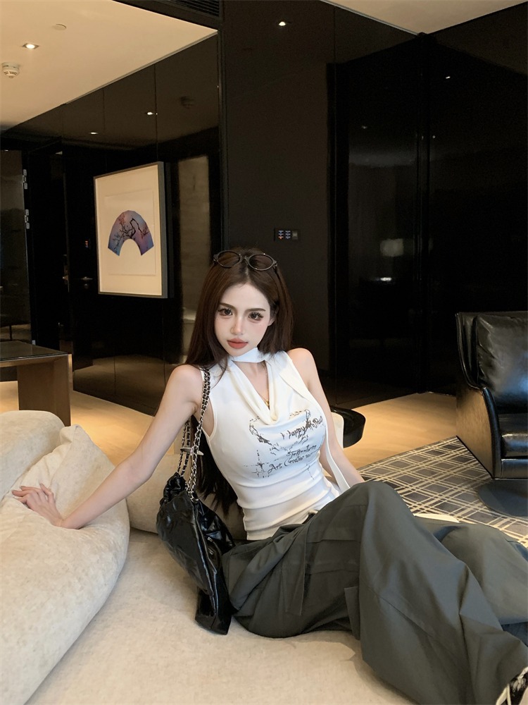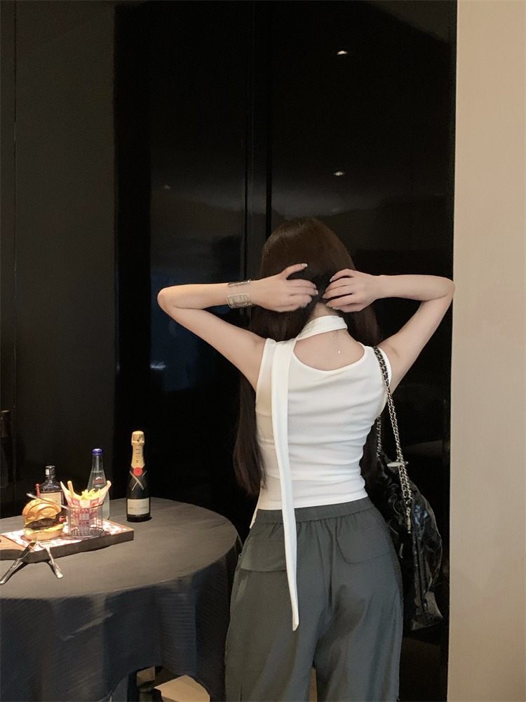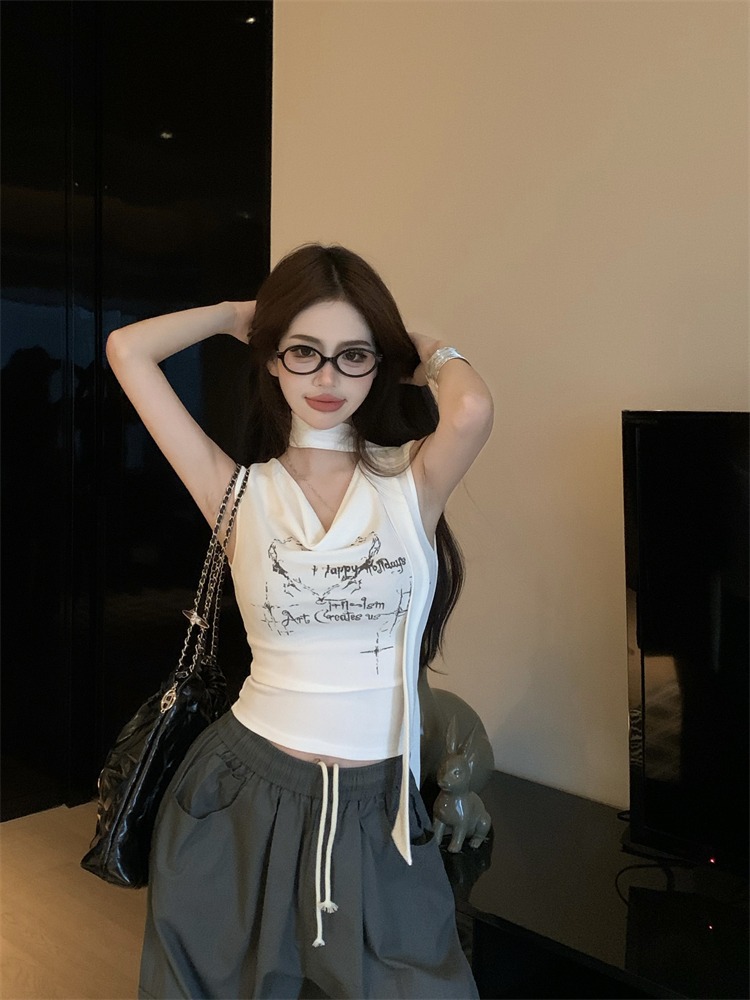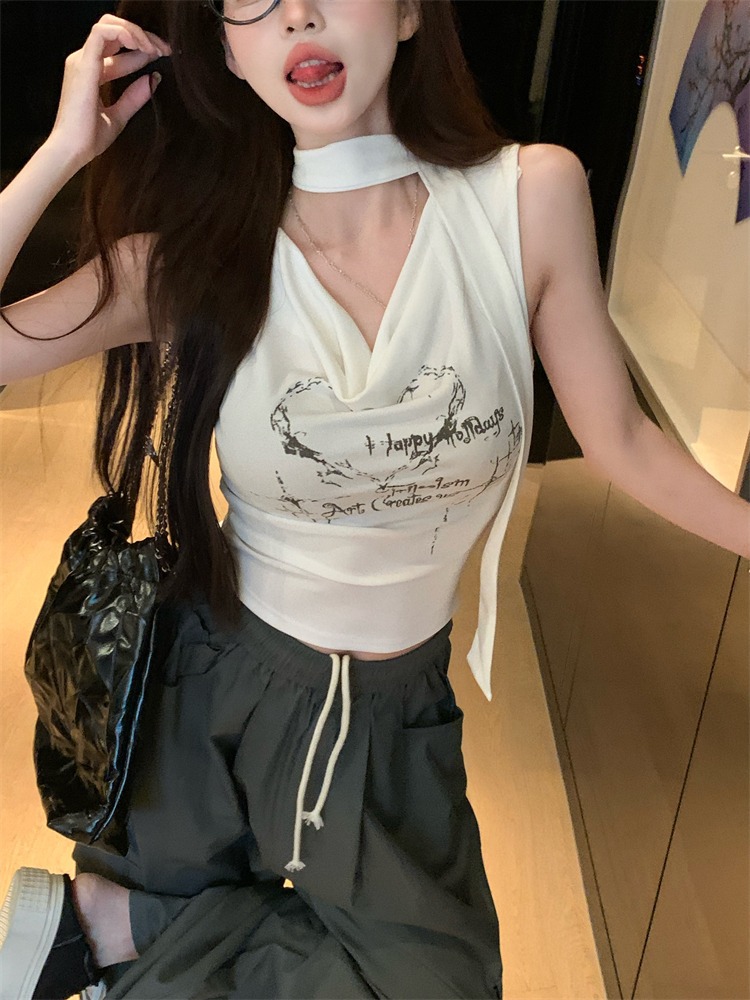 화이트 스트랩 레터 스윙 칼라 순수한 욕망 민소매 홀터 카미솔 여성의 여름 2024 새로운 쇼트 탑 그레이스토어 가기