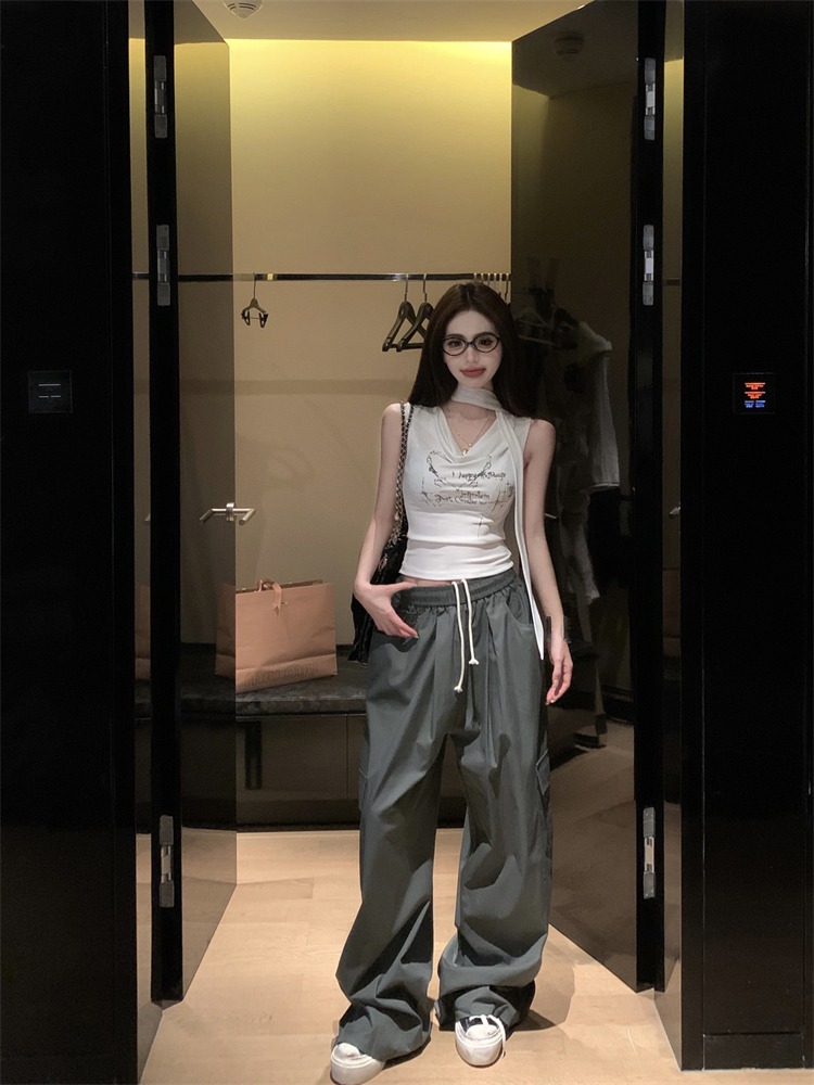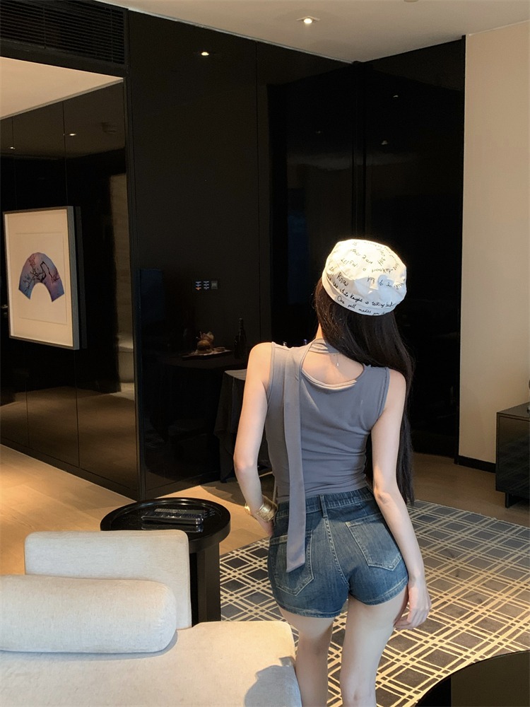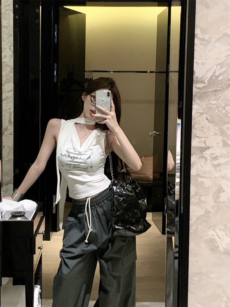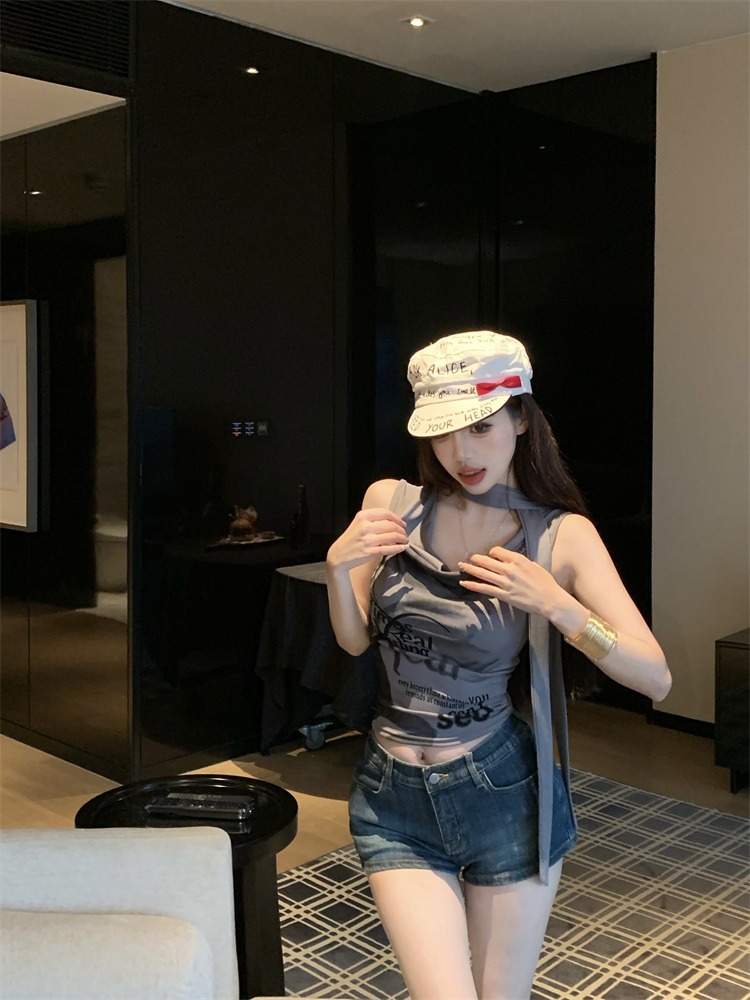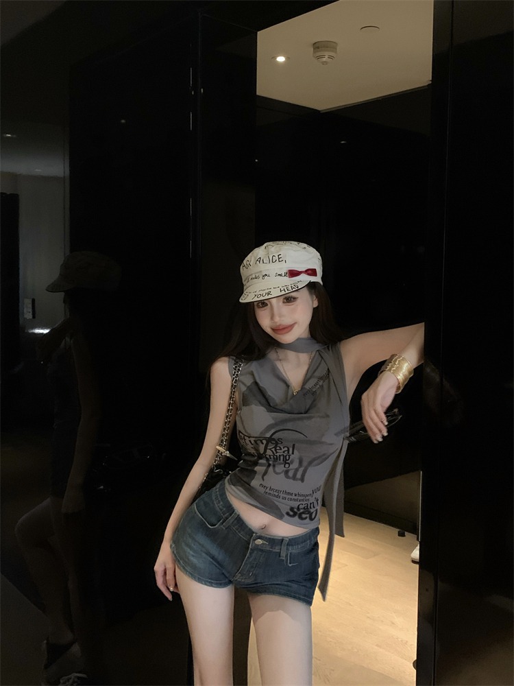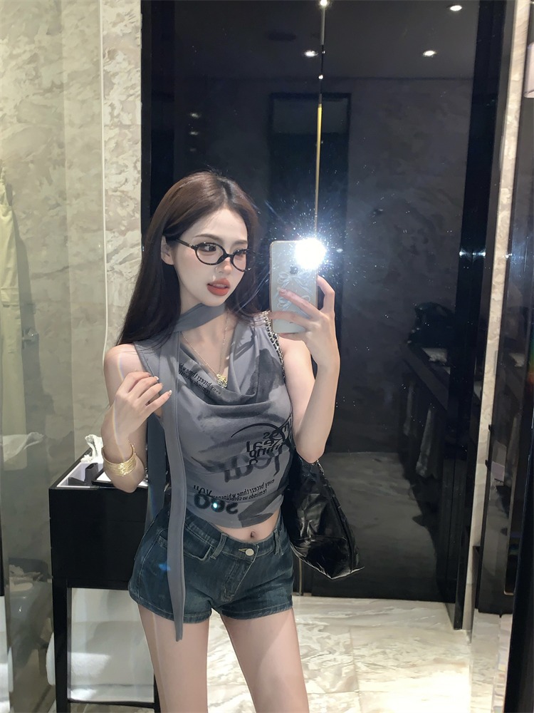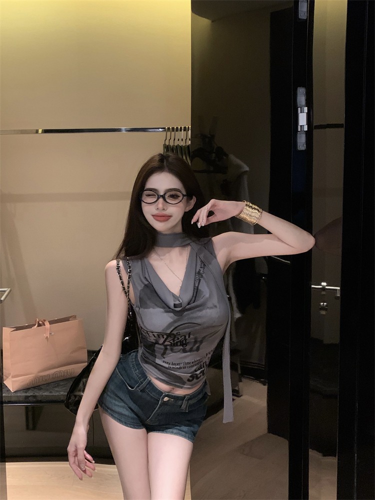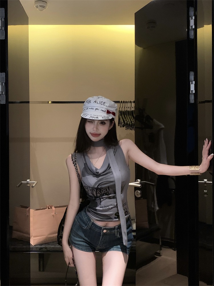화이트 스트랩 레터 스윙 칼라 순수한 욕망 민소매 홀터 카미솔 여성의 여름 2024 새로운 쇼트 탑 그레이
