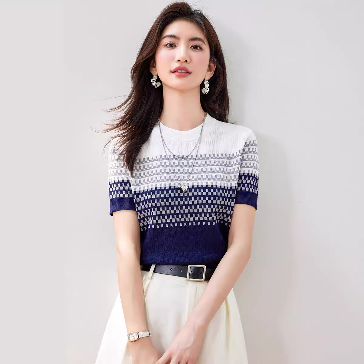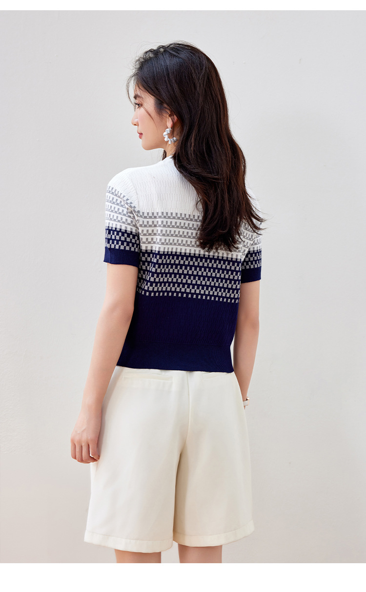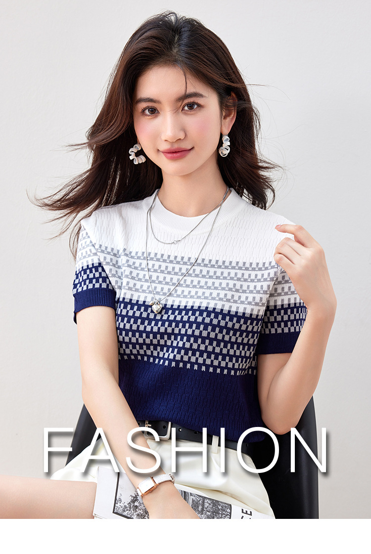 2024 년 여름 새로운 한국식 얇은 줄무늬 아이스 실크 탑 여성용 반팔 티셔츠 고급 자카드 스웨터 트렌디스토어 가기