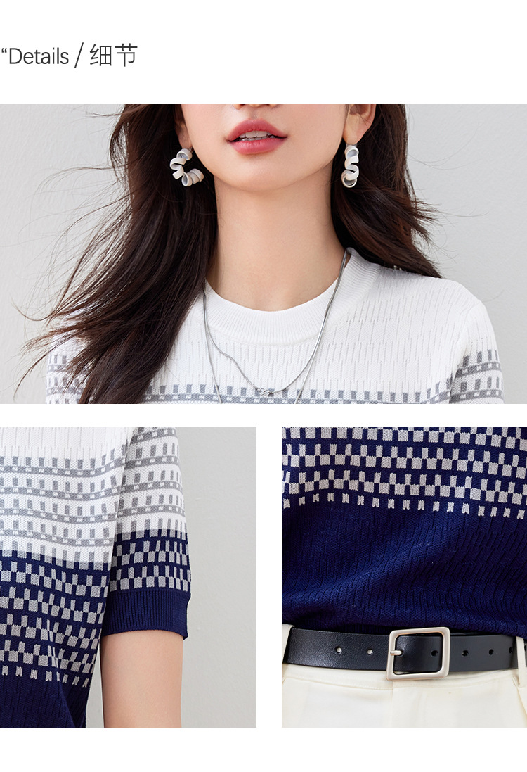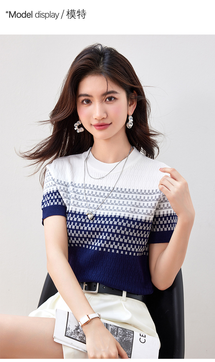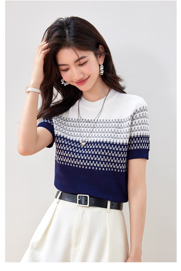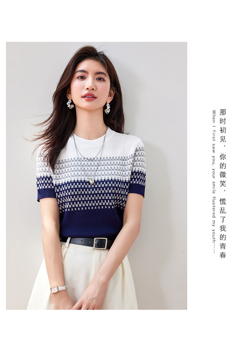 2024 년 여름 새로운 한국식 얇은 줄무늬 아이스 실크 탑 여성용 반팔 티셔츠 고급 자카드 스웨터 트렌디