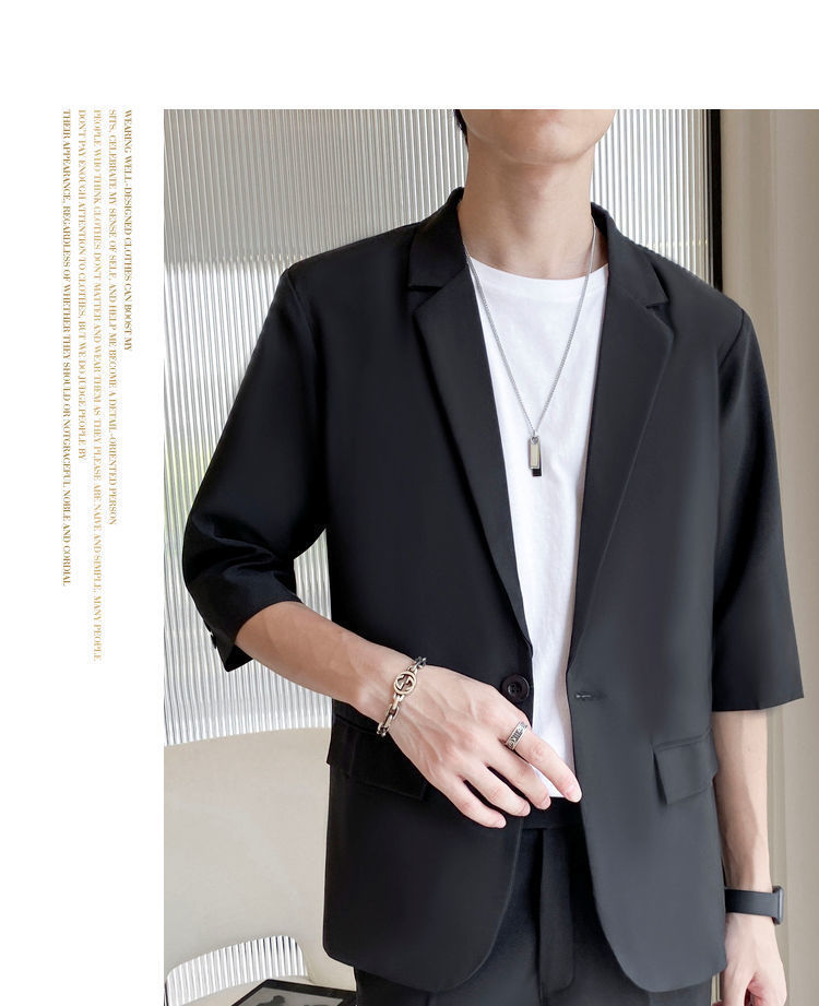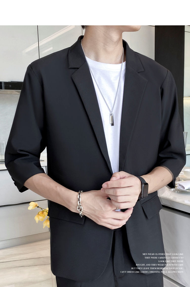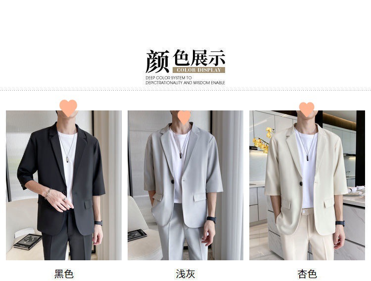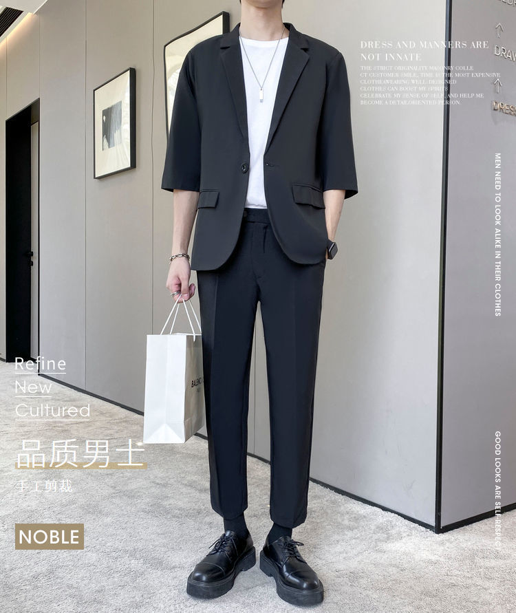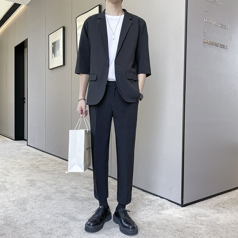 여름 새로운 남자 7 점 슬리브 세트 세트 우아한 재킷 얇은 캐주얼 작은 세트 올 매치 크롭 팬츠