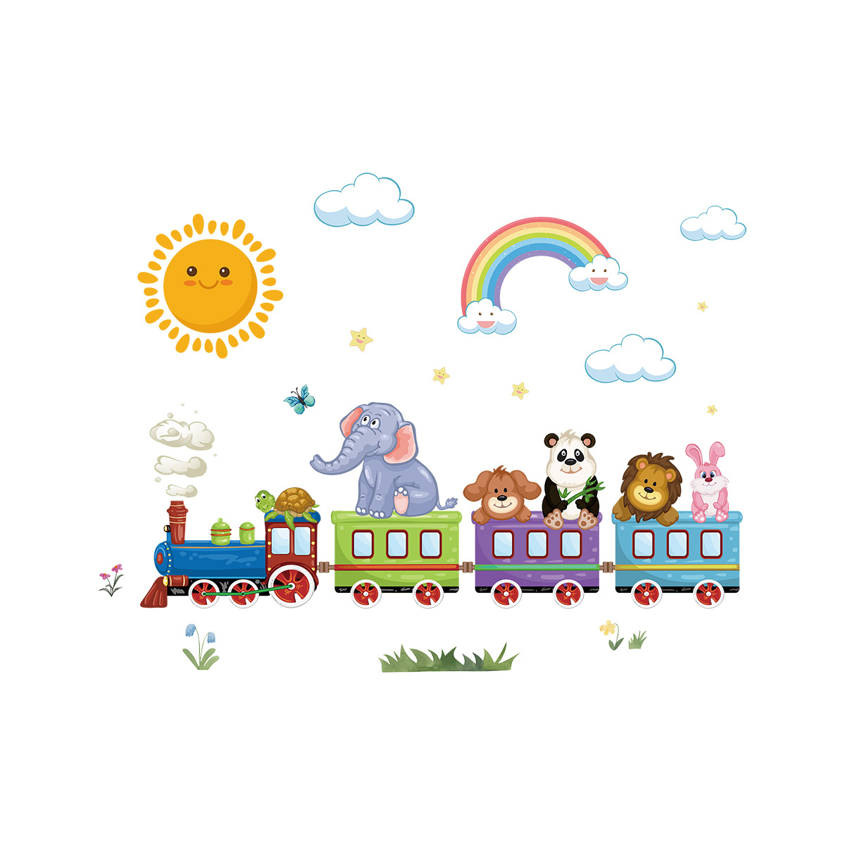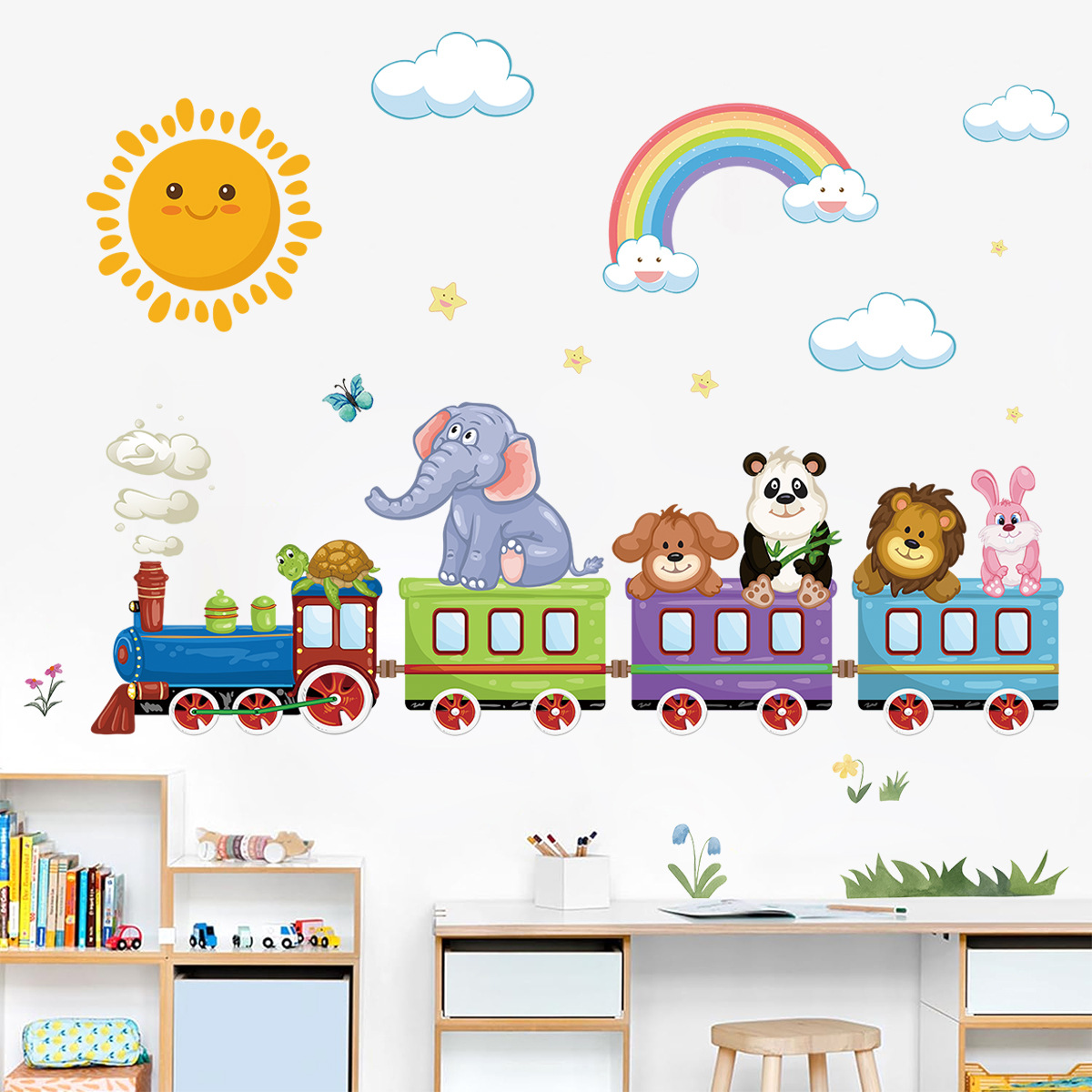 만화 귀여운 작은 동물 기차 자기 접착 벽 스티커 태양 무지개 방 배경 벽 장식 스티커 BR0698E