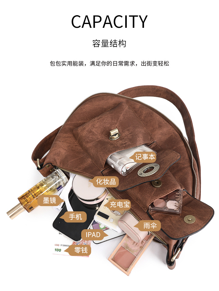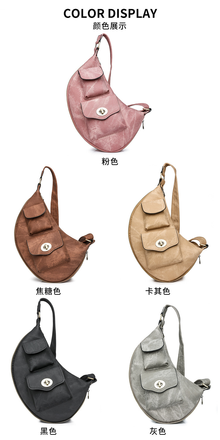 【产品特色】跨境经典女士单肩手提包;产品有五个经典色系可选,采用无手提的设计,使用一根短单肩带代替包包上累赘的手提把,使整件产品更加自然;产品面料使用复古风PU面料,纹路清晰,触感好;产品搭配长短两根不同肩带,均采用可拆卸设计,贴合更多使用场景。
