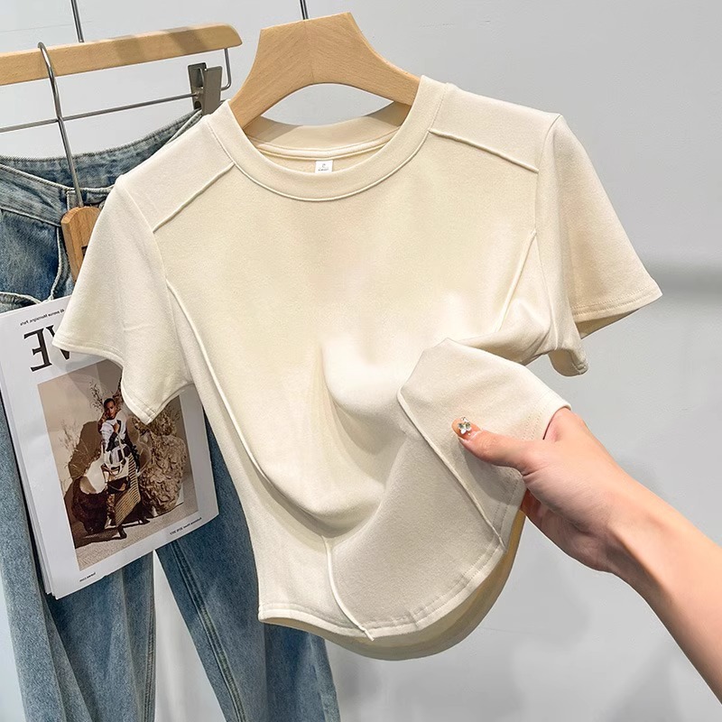 유럽 디자인 센스 피쉬 본 티셔츠 여성 플러스 사이즈 여름 새로운 슬리밍 라운드 넥 셔츠 짧은 소매 틈새 올 매치 탑스토어 가기