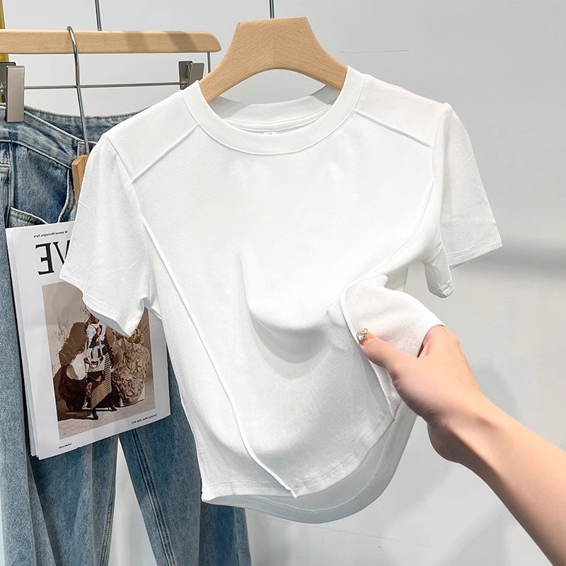 유럽 디자인 센스 피쉬 본 티셔츠 여성 플러스 사이즈 여름 새로운 슬리밍 라운드 넥 셔츠 짧은 소매 틈새 올 매치 탑