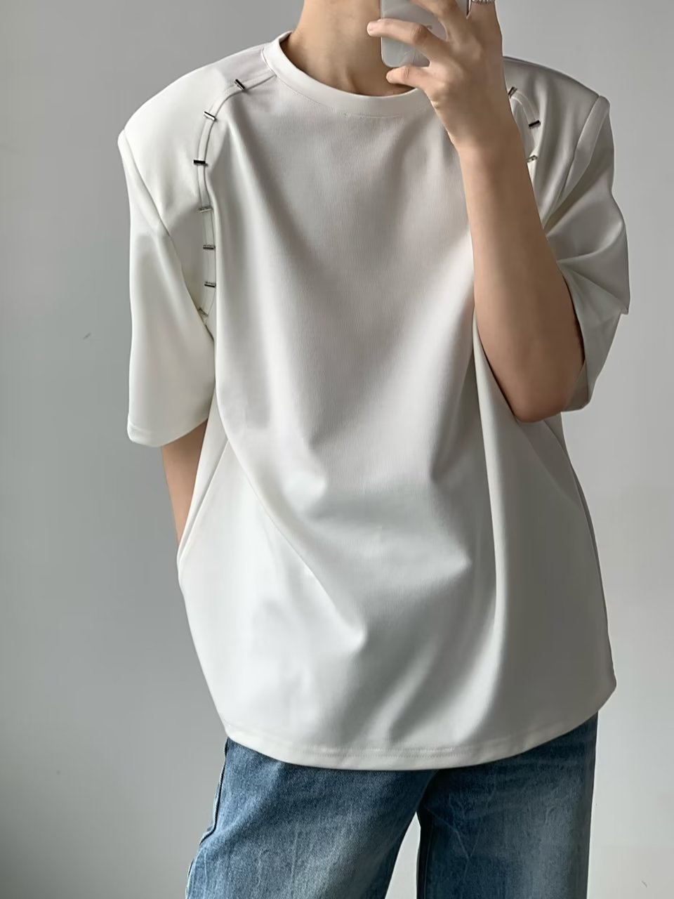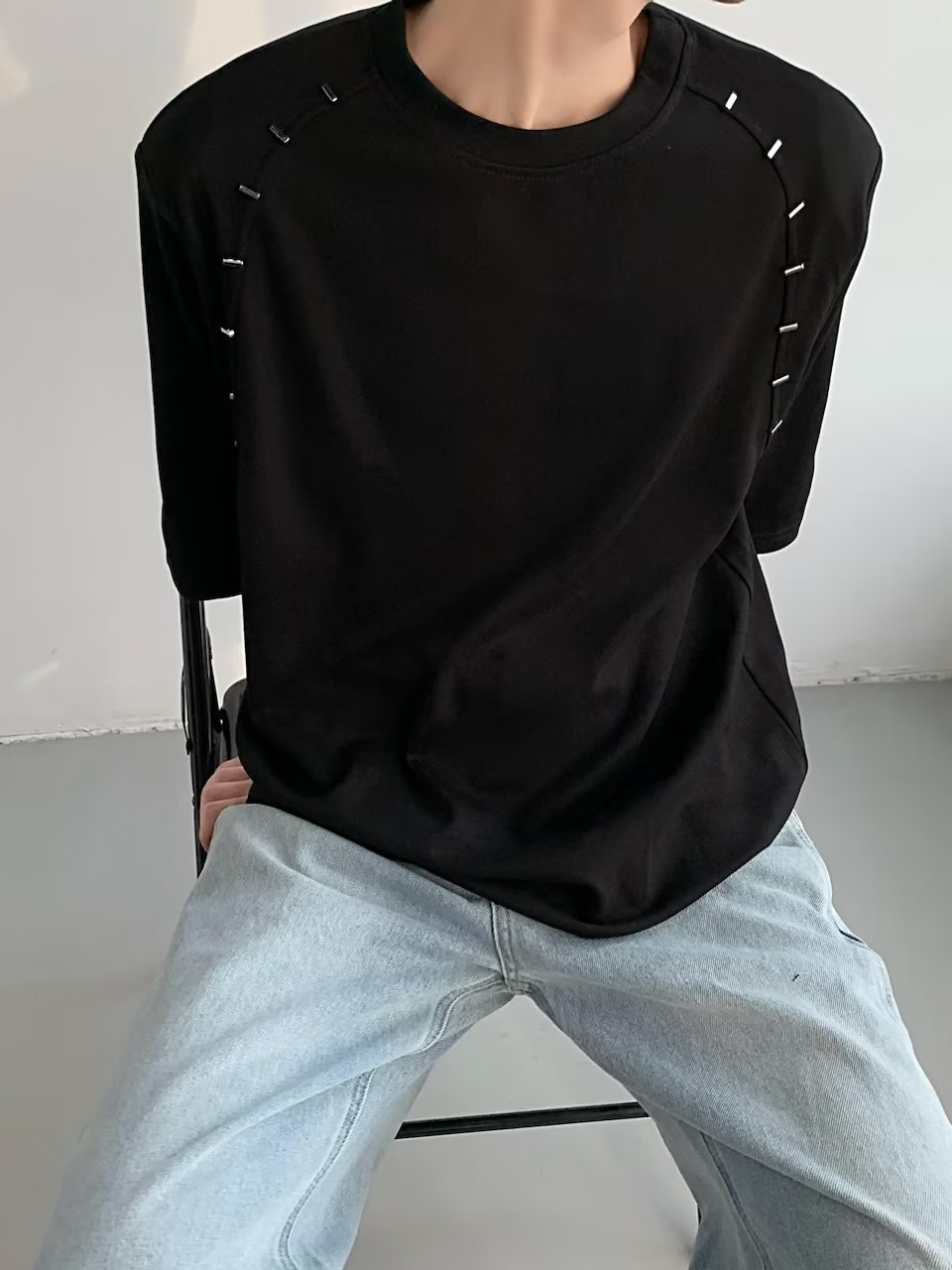 틈새 디자인 센스 패드 어깨 반팔 티셔츠 남성 여름 거리 패션 브랜드 느슨한 미국 라운드 넥 티셔츠 탑스토어 가기