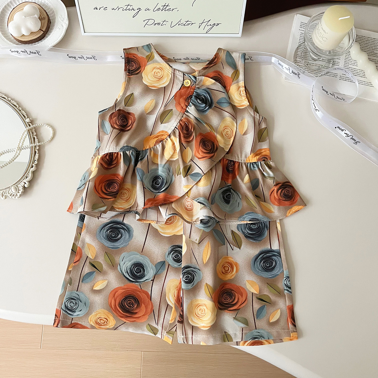 소녀의 세트 2024 여름 새로운 한국 인쇄 조끼 셔츠 넓은 다리 바지 세트 소녀의 상쾌한 투피스 세트스토어 가기