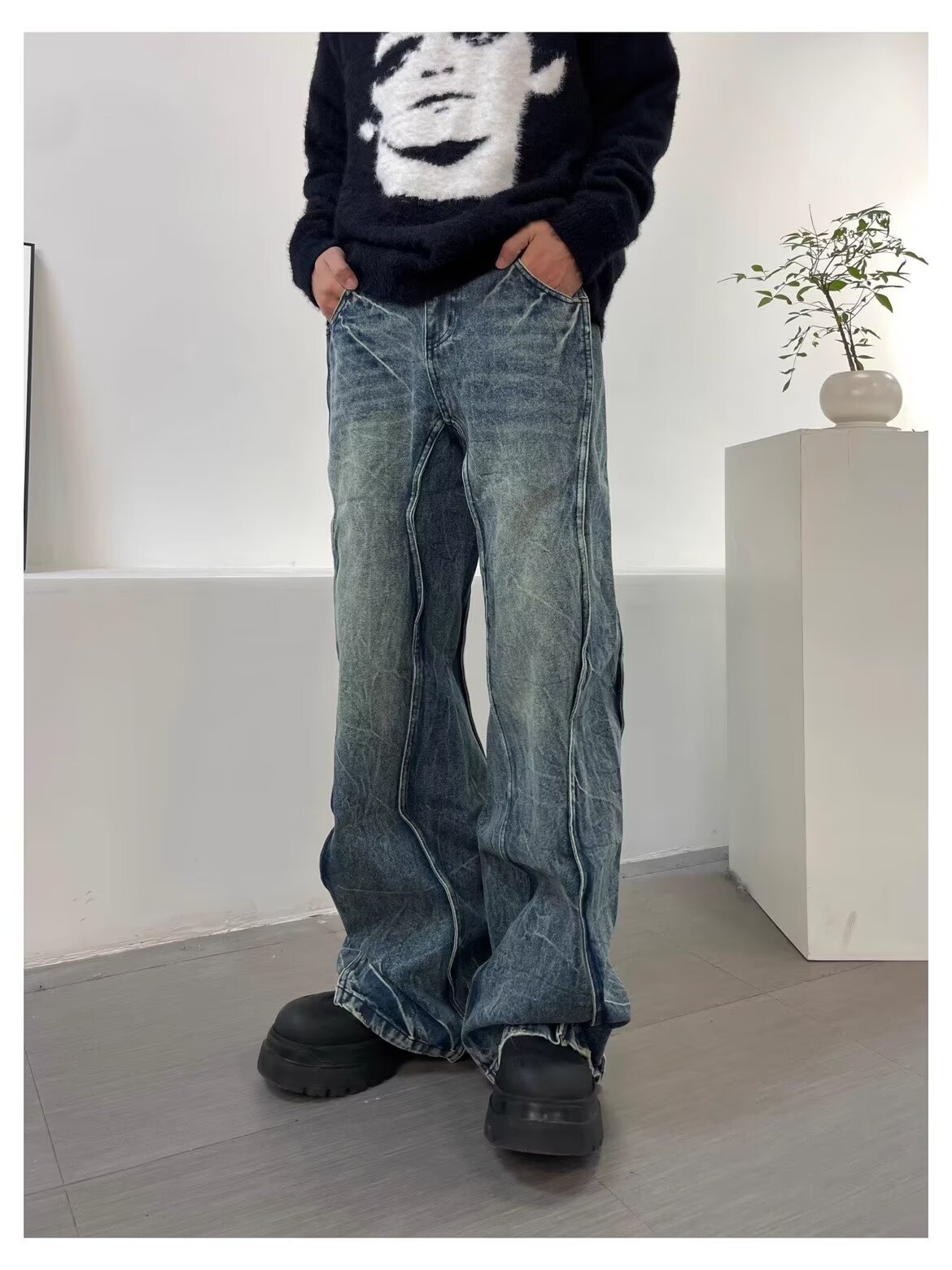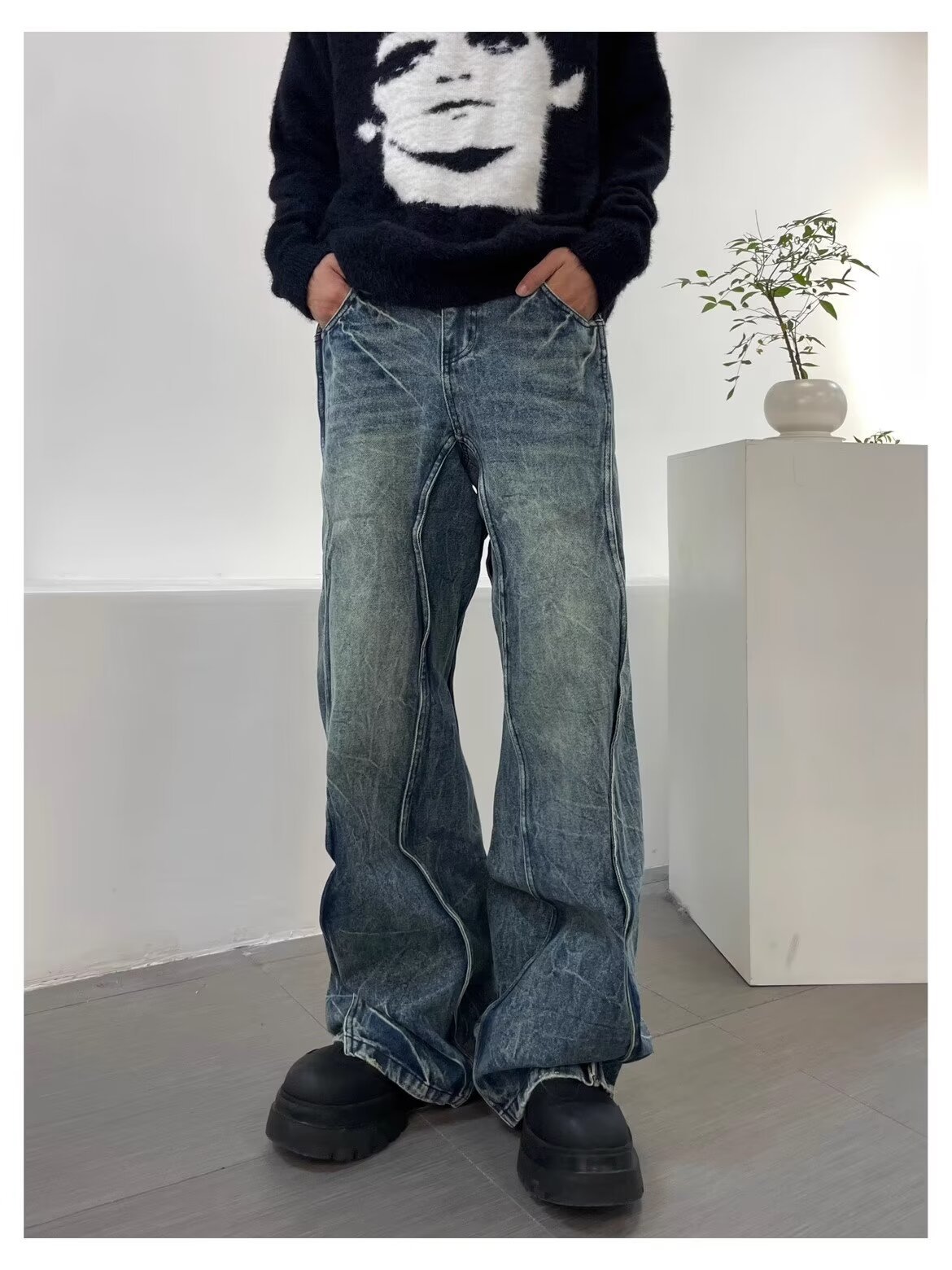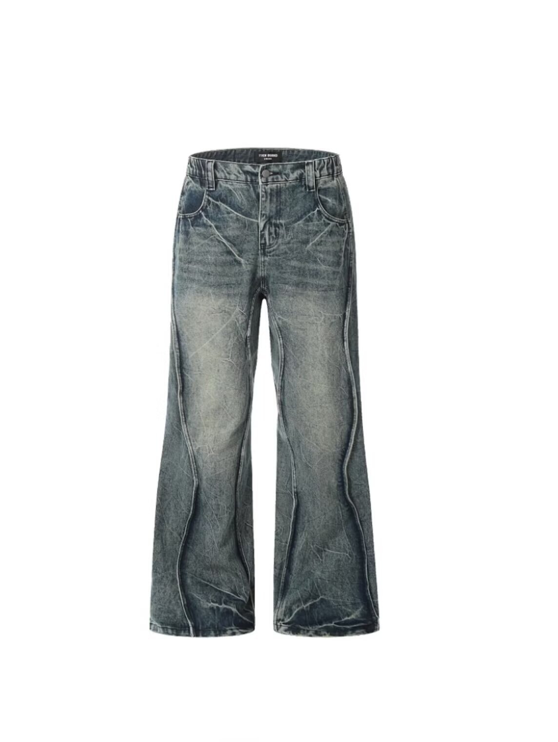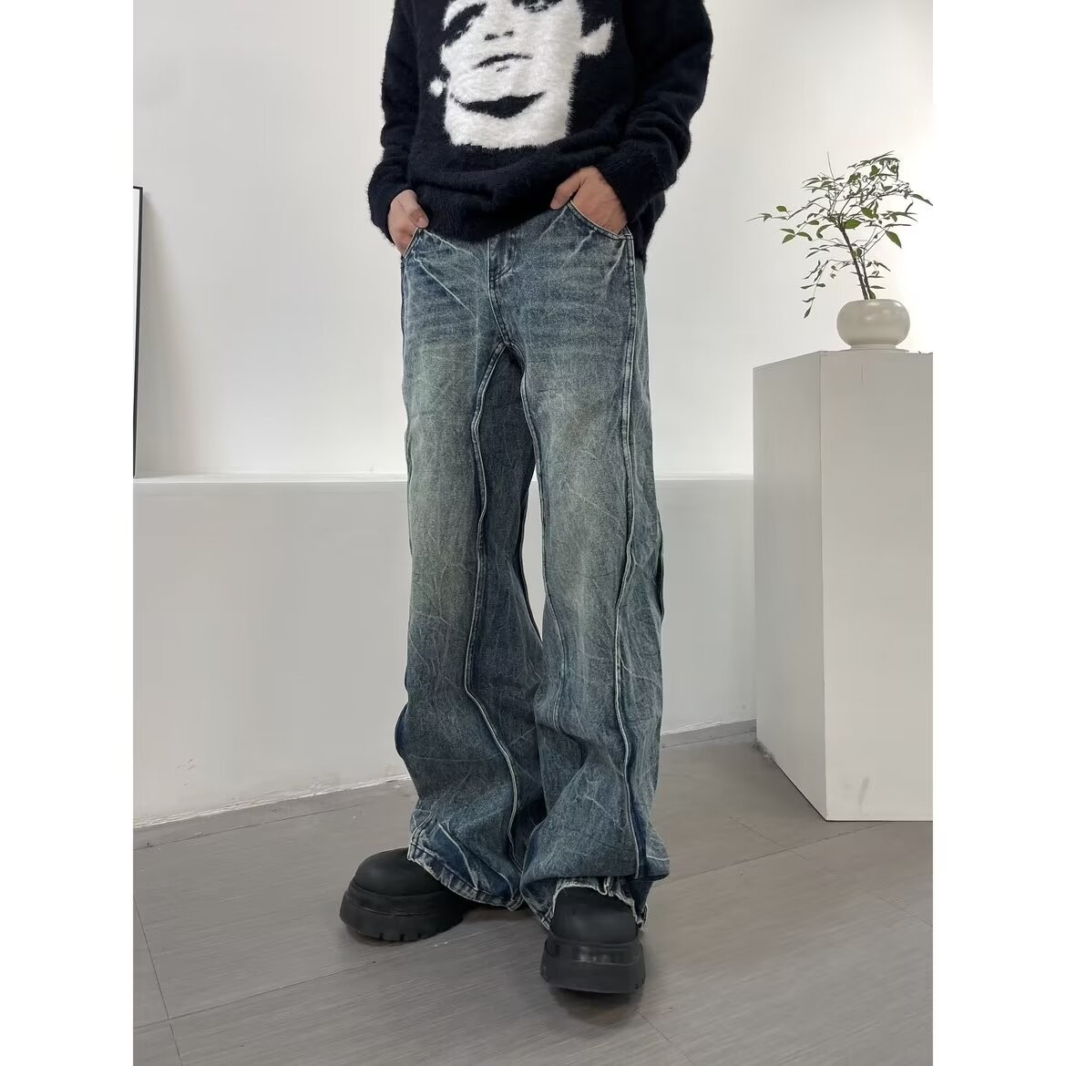 미국 레트로 헤비 세탁 느슨한 스트레이트 팬츠 남성 하이 스트리트 스티칭 디자인 트렌디 브랜드 번개 균열 청바지