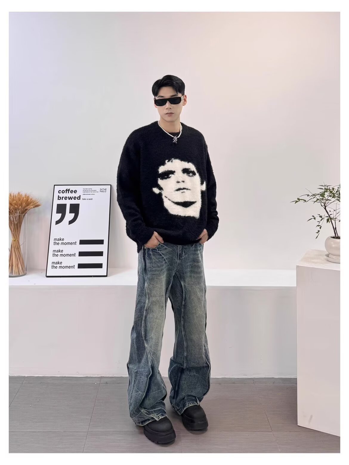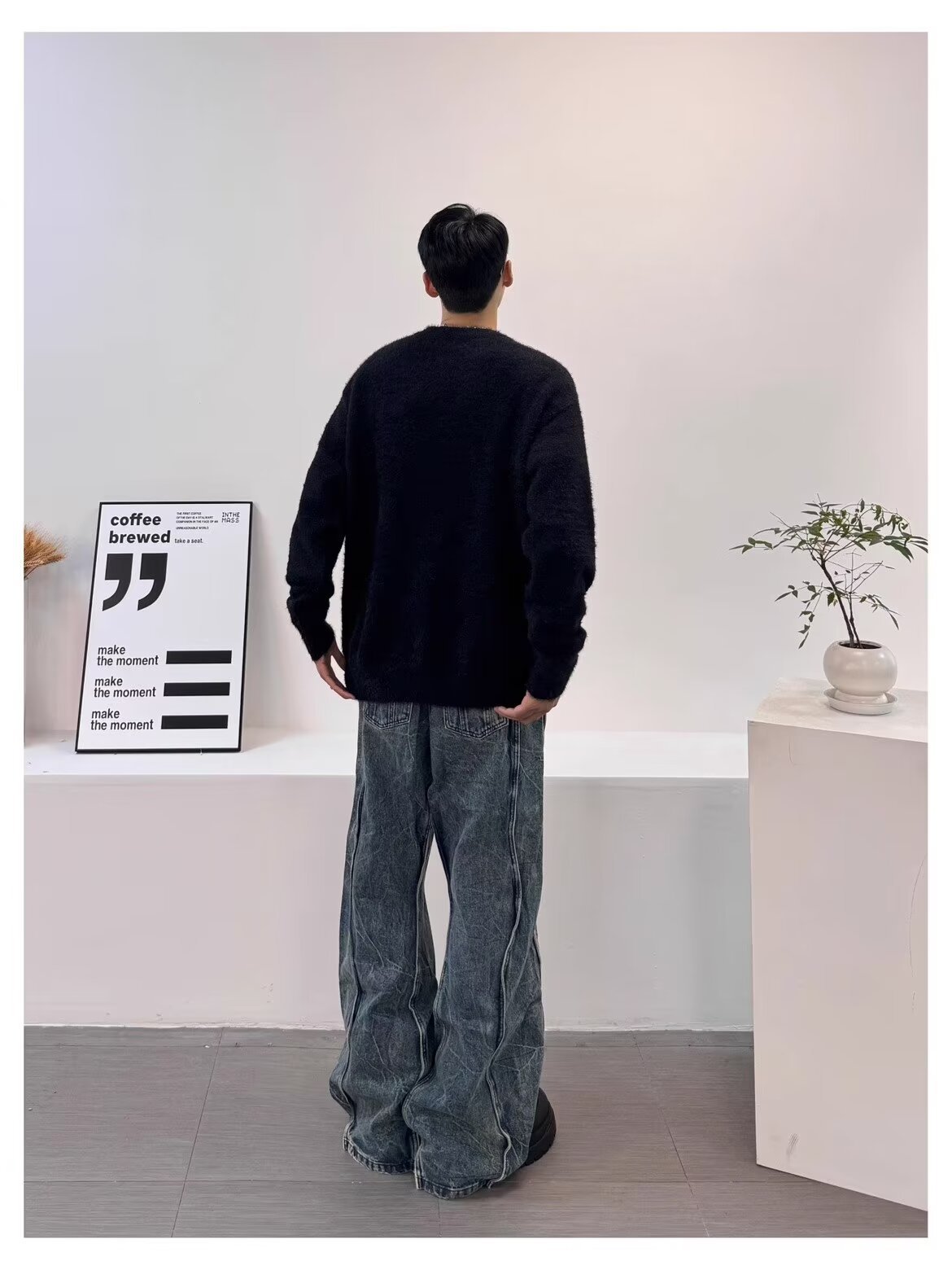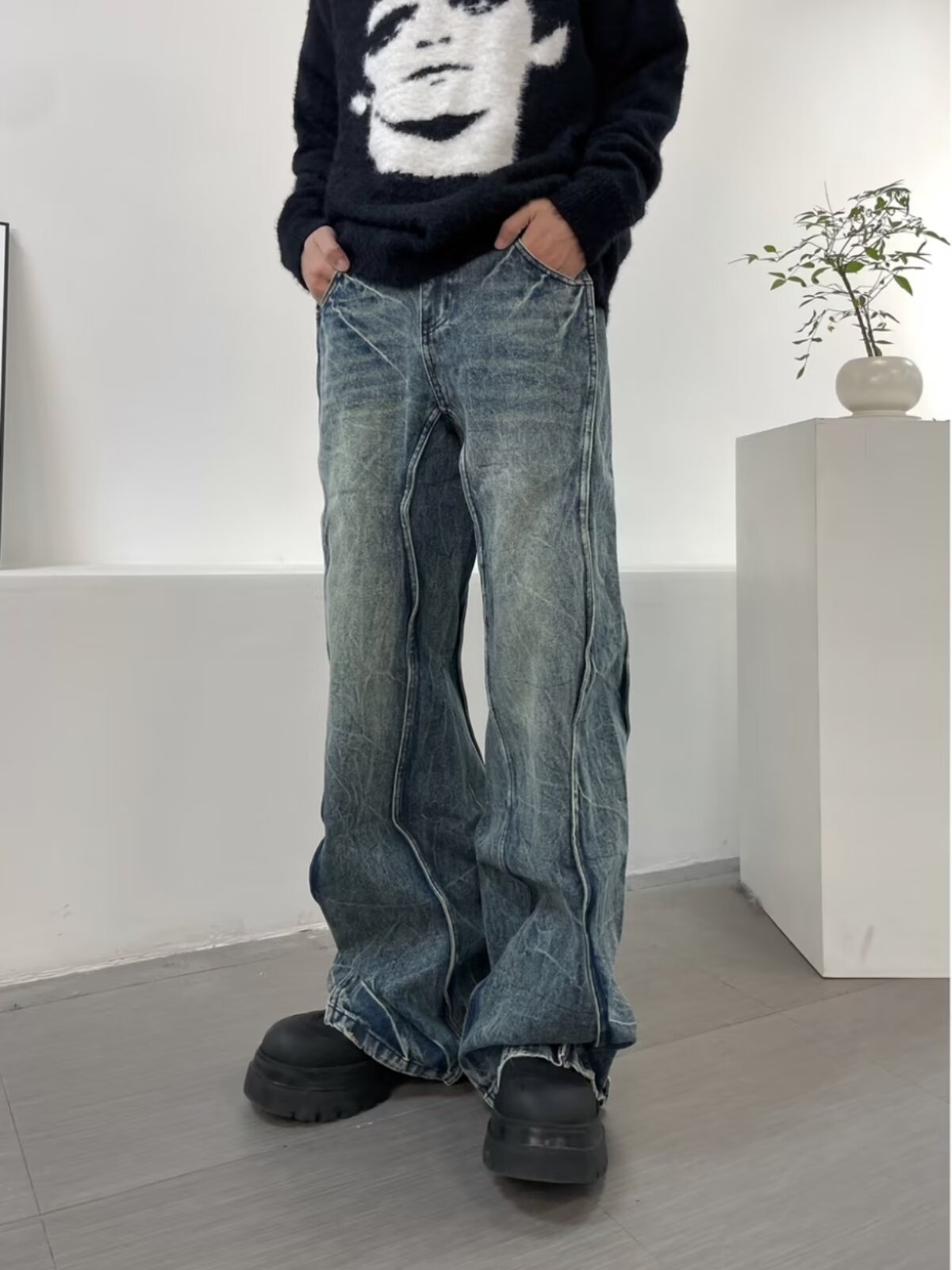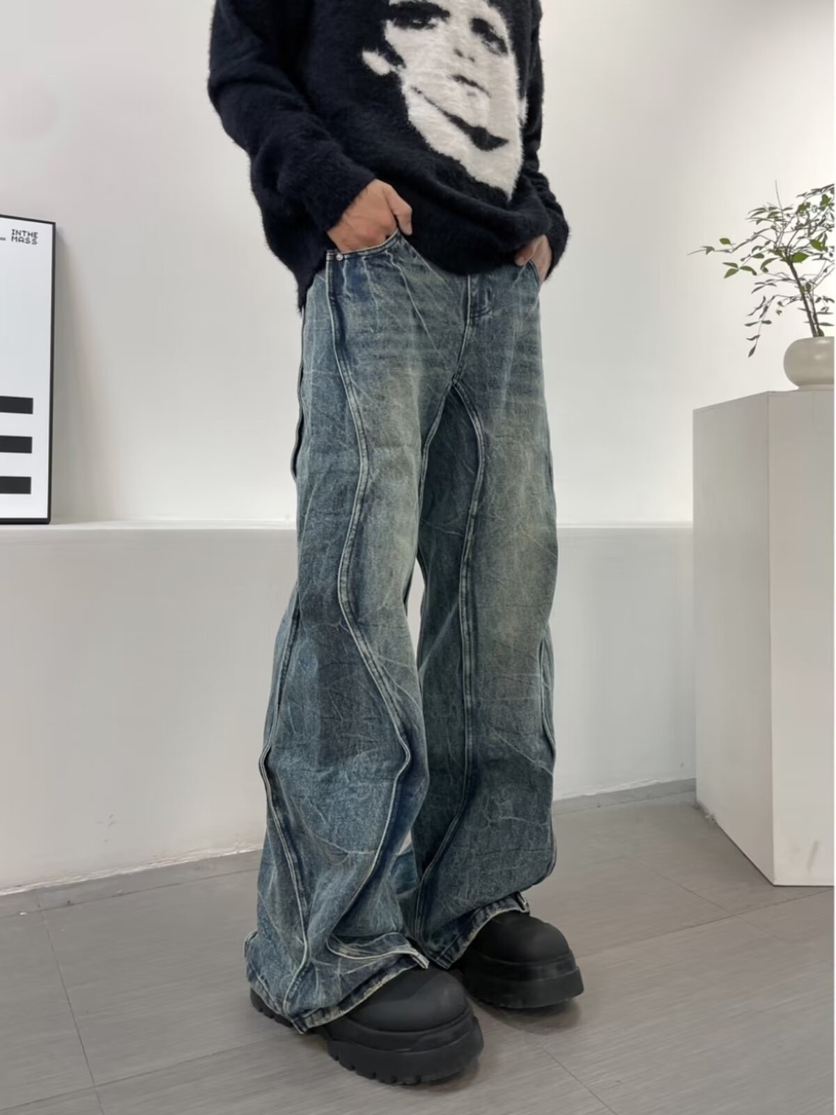 미국 레트로 헤비 세탁 느슨한 스트레이트 팬츠 남성 하이 스트리트 스티칭 디자인 트렌디 브랜드 번개 균열 청바지