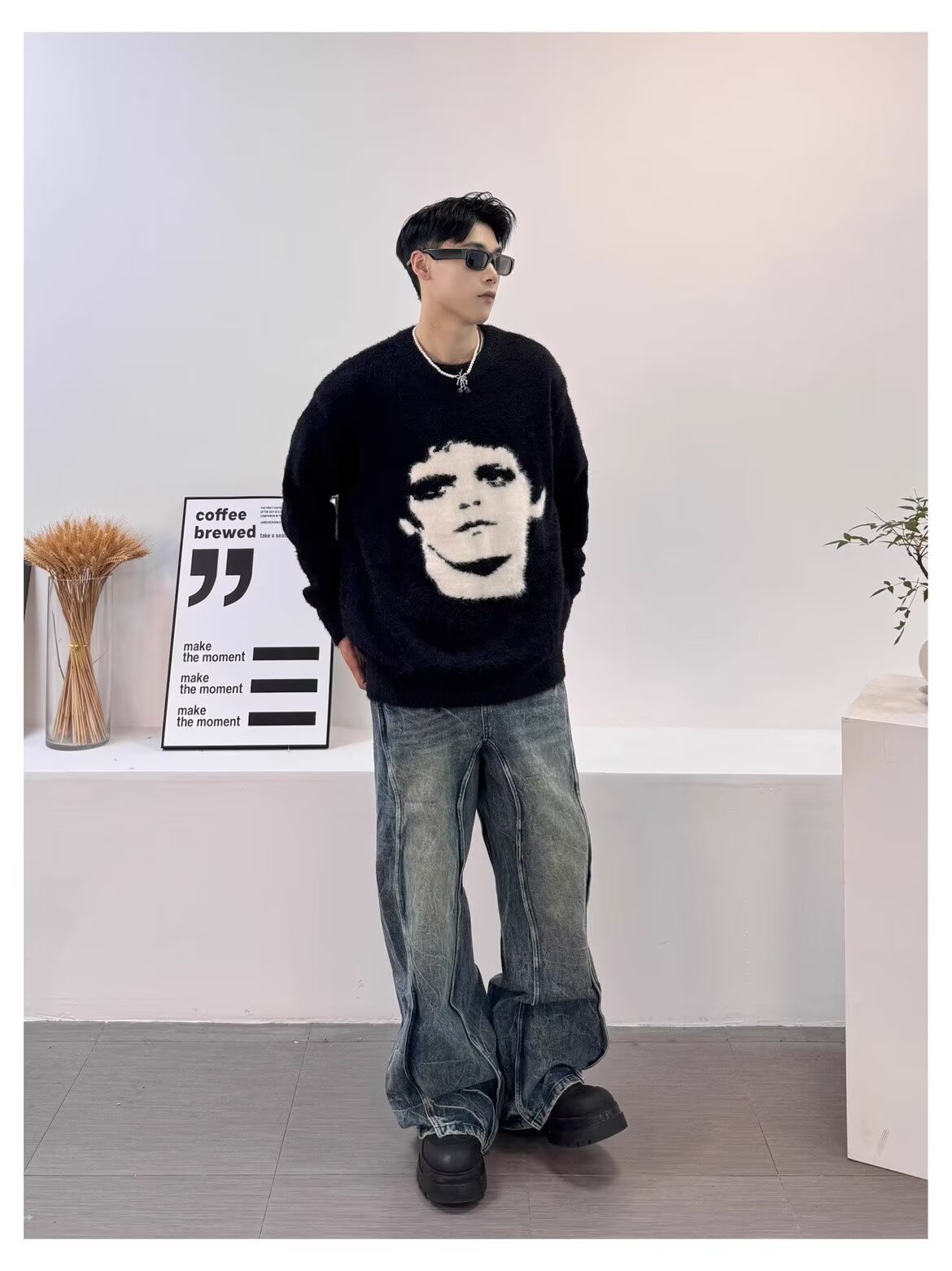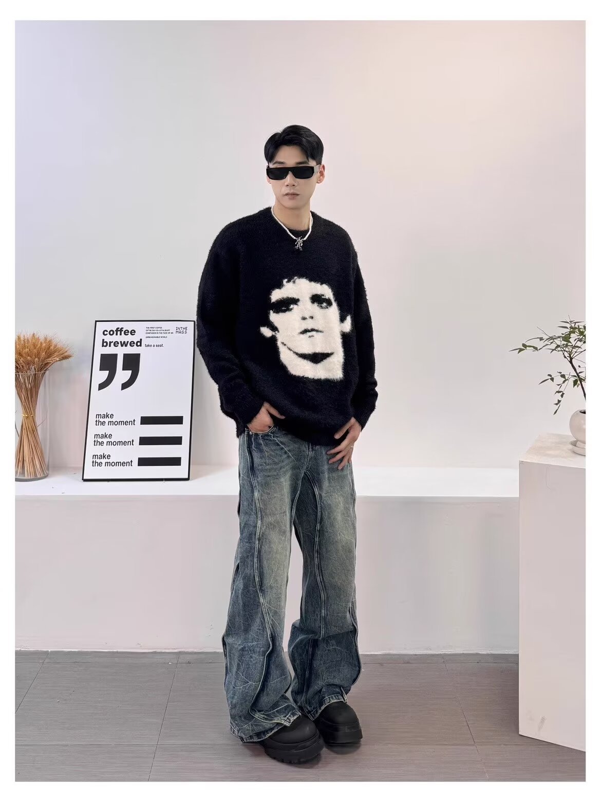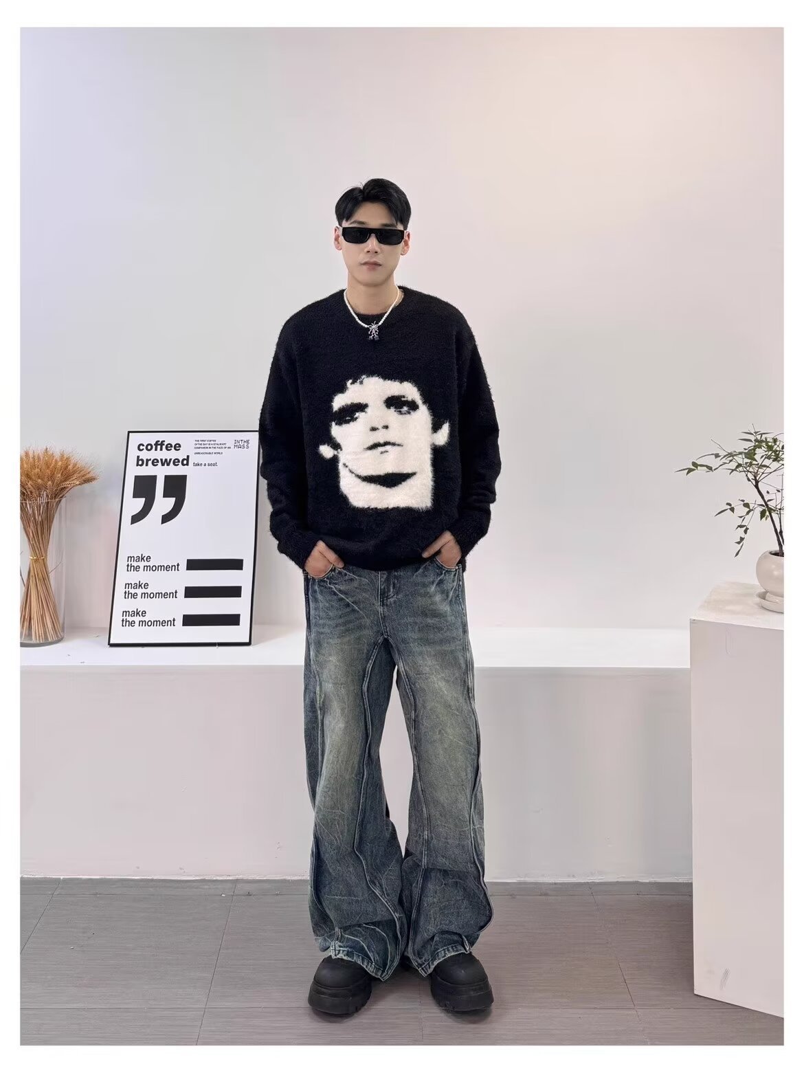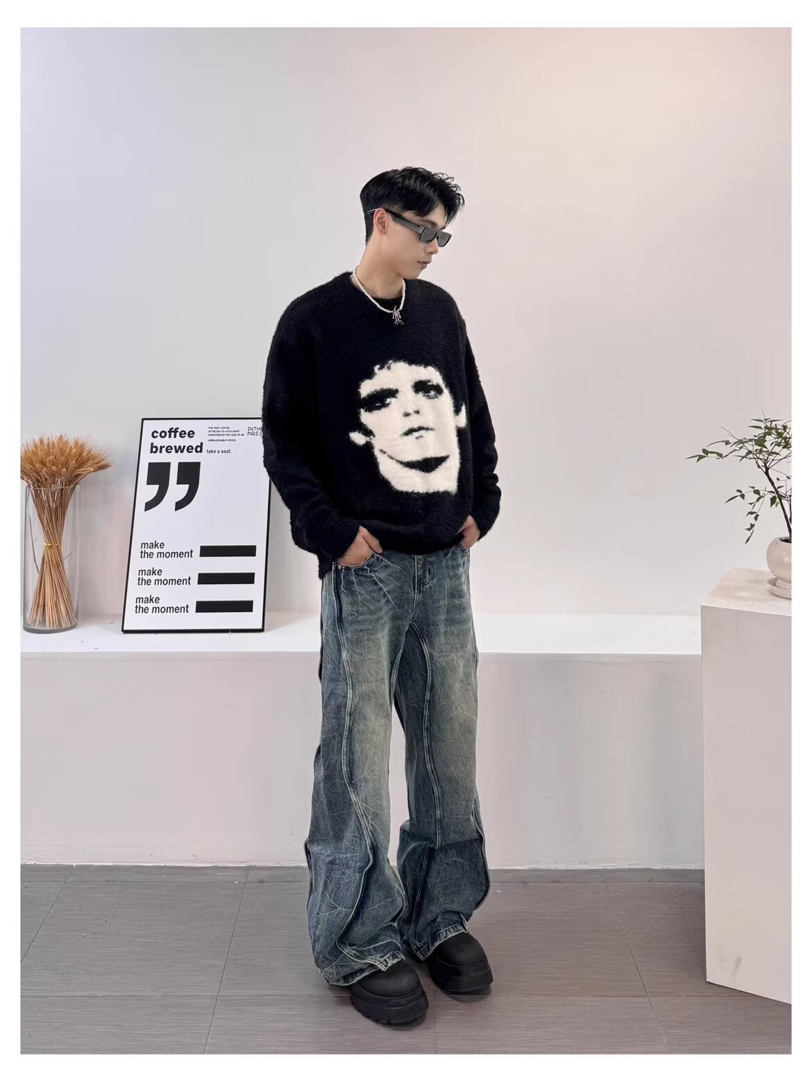 미국 레트로 헤비 세탁 느슨한 스트레이트 팬츠 남성 하이 스트리트 스티칭 디자인 트렌디 브랜드 번개 균열 청바지