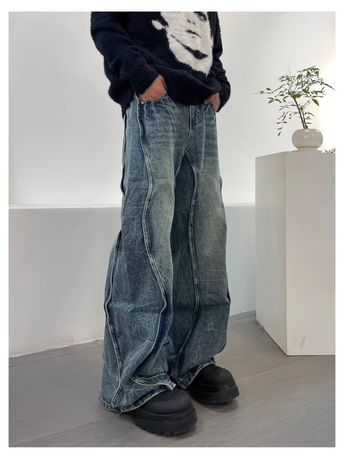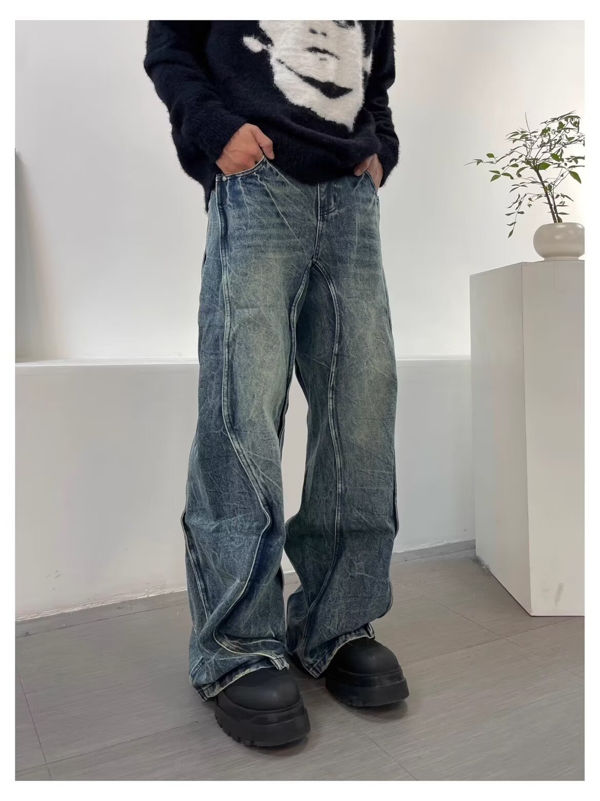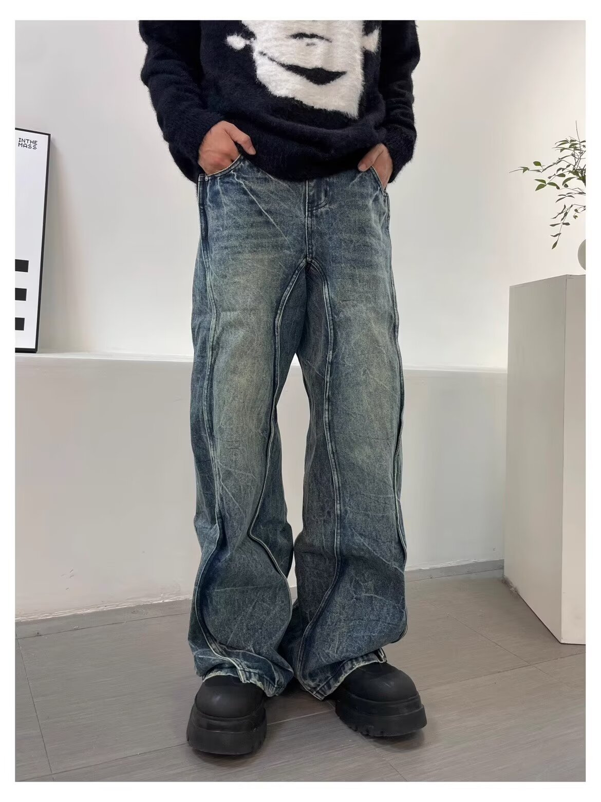 미국 레트로 헤비 세탁 느슨한 스트레이트 팬츠 남성 하이 스트리트 스티칭 디자인 트렌디 브랜드 번개 균열 청바지스토어 가기