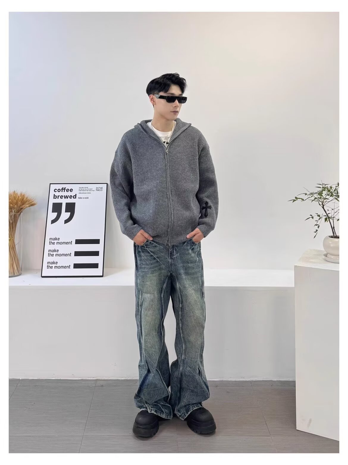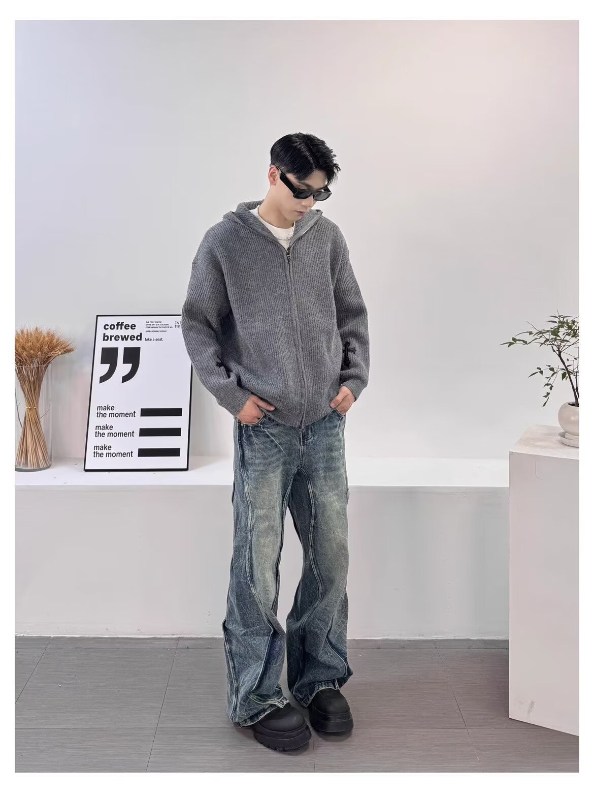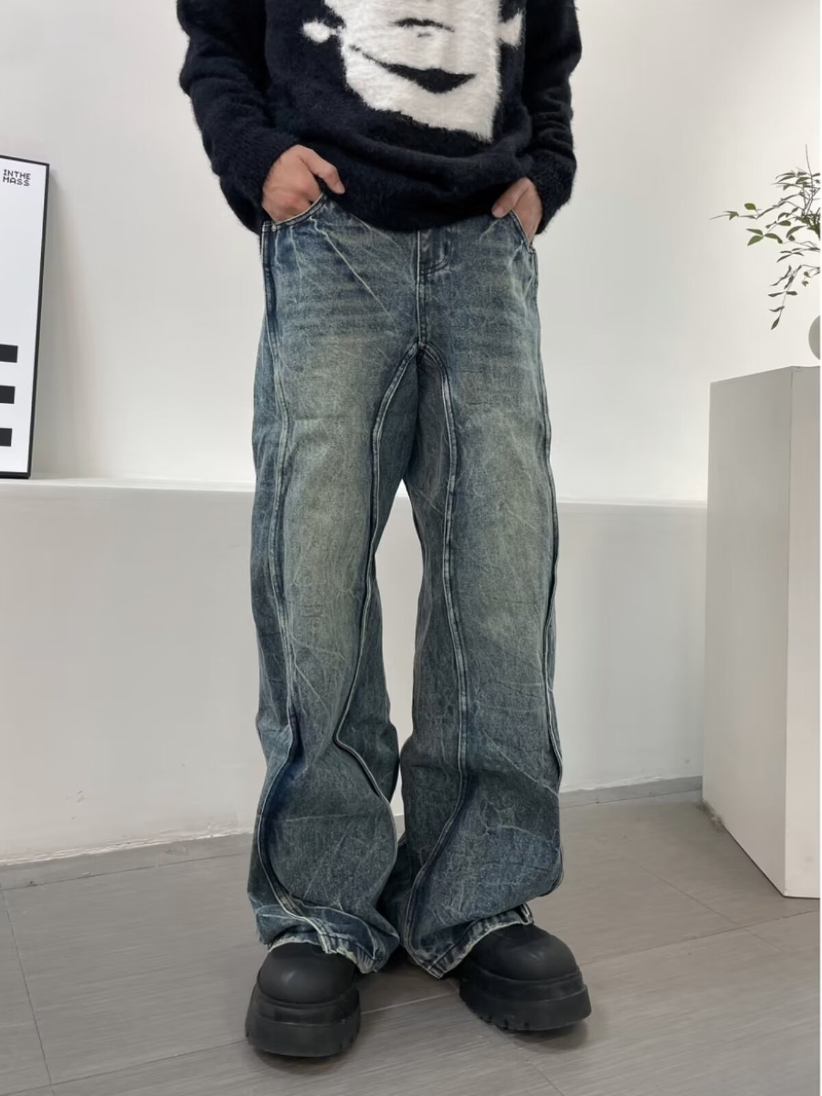 미국 레트로 헤비 세탁 느슨한 스트레이트 팬츠 남성 하이 스트리트 스티칭 디자인 트렌디 브랜드 번개 균열 청바지스토어 가기