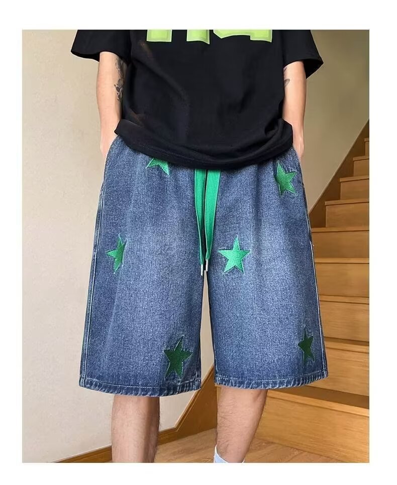 여름 유행 잘 생긴 클래식 청바지 5 개 별 블루 레트로 레이스 업 학생 반바지 남성스토어 가기