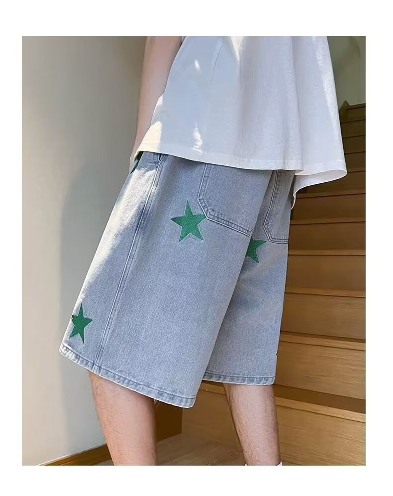 여름 유행 잘 생긴 클래식 청바지 5 개 별 블루 레트로 레이스 업 학생 반바지 남성