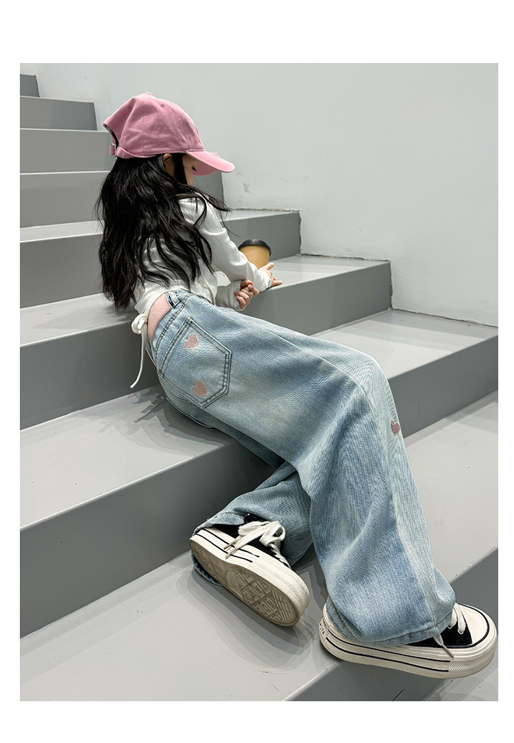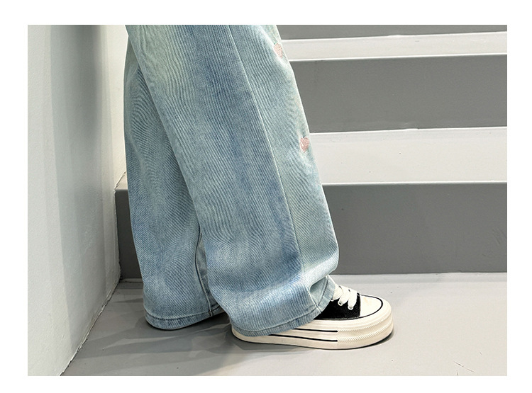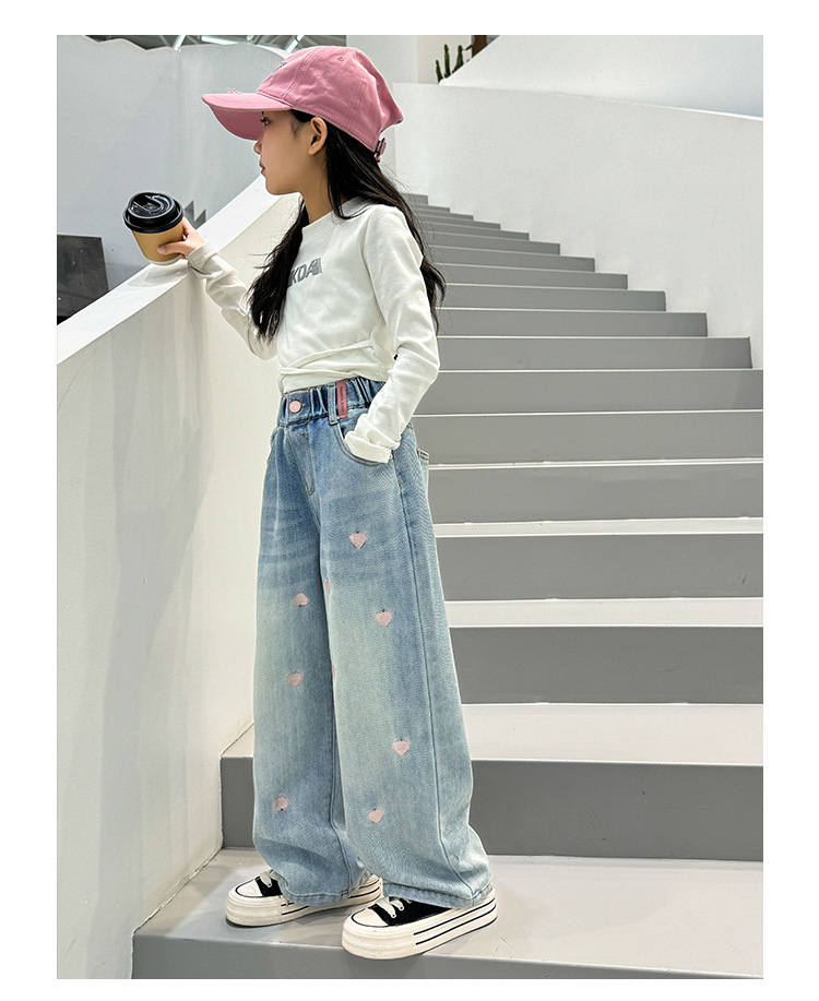 소녀 바지 2024 가을 새로운 유행 사랑 자수 슬림 캐주얼 바지 큰 어린이 좁은 데님 넓은 다리 바지스토어 가기