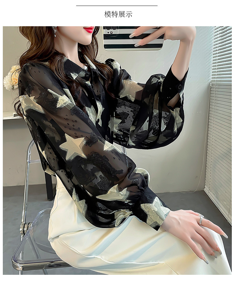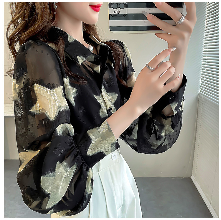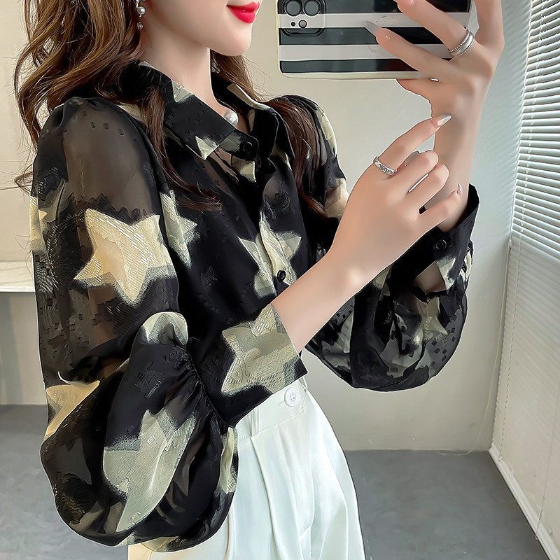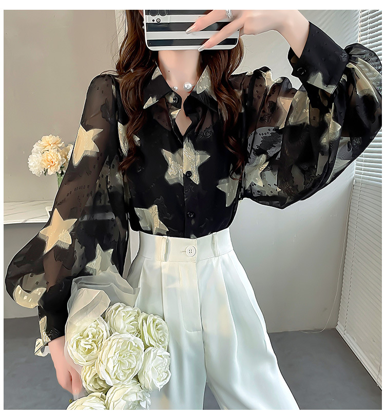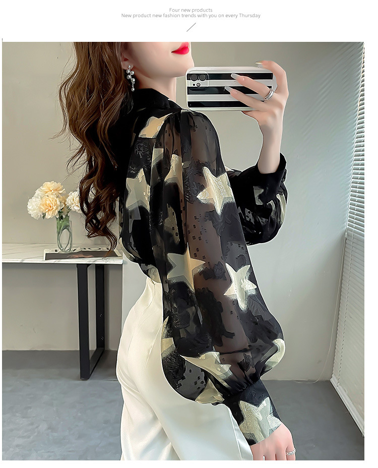 올해 인기있는 아름다운 탑 작은 별 인쇄 자수 셔츠 여성용 가을 쉬폰 슬림 랜턴 소매 셔츠스토어 가기